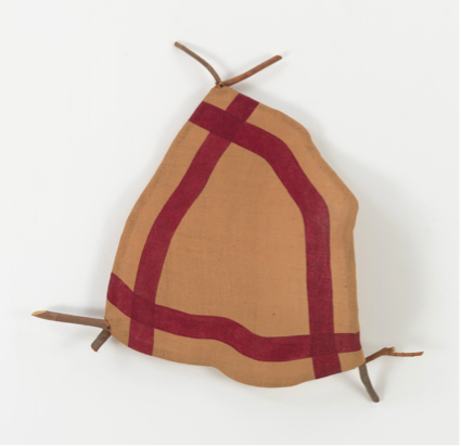 “Untitled” (1998) is triangular in shape. It could be thought of as a shaped canvas in which a piece of burlap has been stretched over tree branches that have secured into a triangle. On the burlap Lukin has painted three dark red bands that seem to conform to the branches beneath.