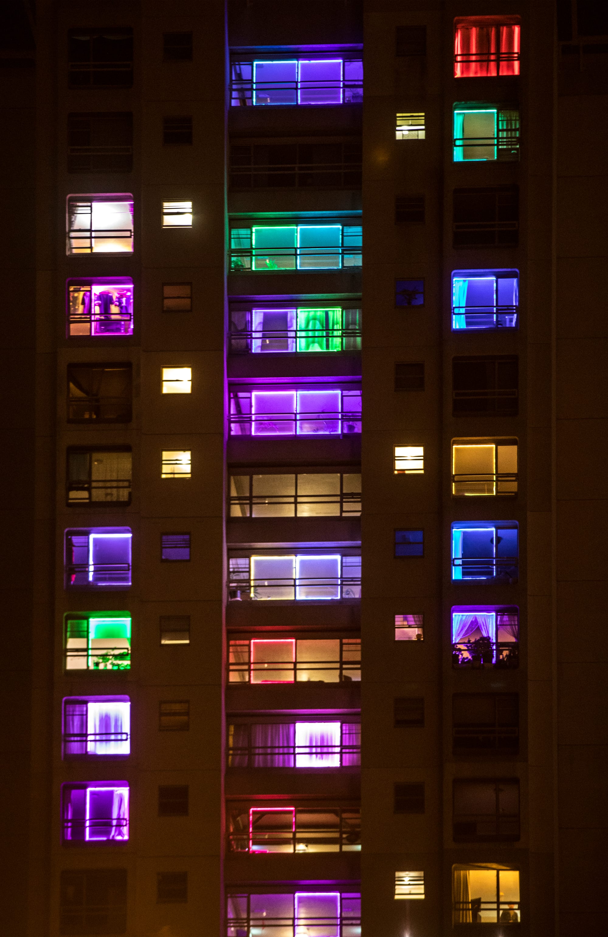 Launched last week, #WeLiveHere2017 represents two years of planning by Waterloo residents and local activists that began soon after the state government announced its redevelopment plans. The illuminated towers, known as Matavaia and Turanga, were chosen as they are the tallest in the estate, each rising 29 floors to overlook the surrounding cityscape. Residents interested in participating were given free lights whose color they can control to express how they feel about the redevelopment. The multicolor checkers stand out against the dark sky, persistent like the always-flashing buttons of an arcade game machine.
