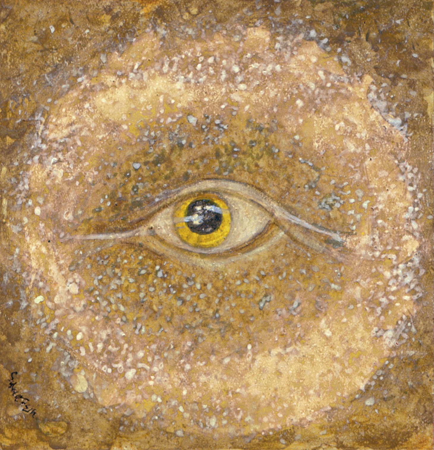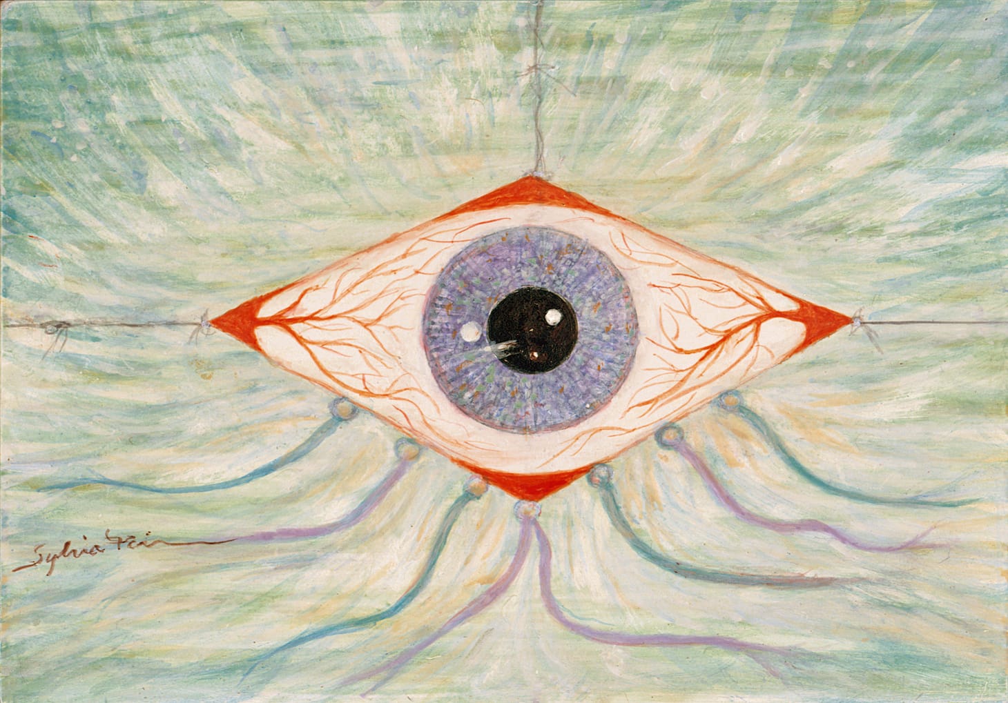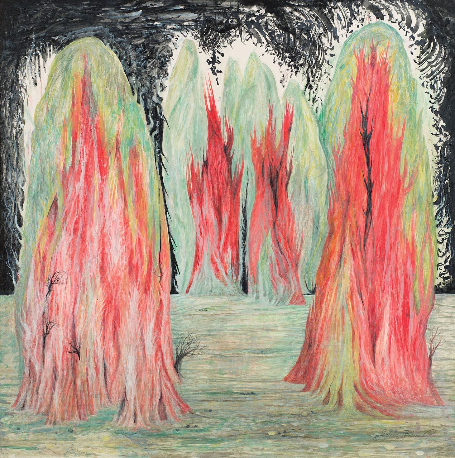 She was soon creating a new series of works depicting eyes, cats, the cosmos, and trees. One of the most beautiful and arresting works in the current show, “The Painting Told Me What to Do” (2012), appears to be trees on fire from within. “Something got my hand,” Fein said. “It painted itself.” The ghostly, burning shapes conjure scenes from Dante’s Inferno as well as the seemingly endless fires consuming Northern California, where she’s lived for over 70 years. Throughout her long, productive life, the paintings of Sylvia Fein remain where past and present magically meet.