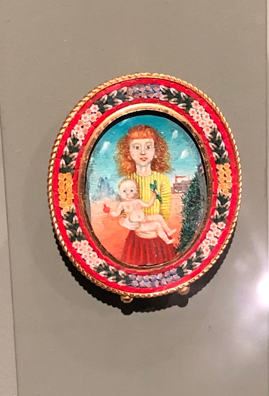 Still, Fein kept painting. And she had a daughter, Heidi, who in one small oval portrait (Fein and her husband had a boat for years, during which time she made postcard-sized paintings, and smaller) Fein depicts as a naked baby sitting in her mother’s arms. Northern Renaissance meets Northern California, with the artist as her own Madonna, holding her infant who, like Christ sometimes does, holds a pomegranate in one chubby hand.