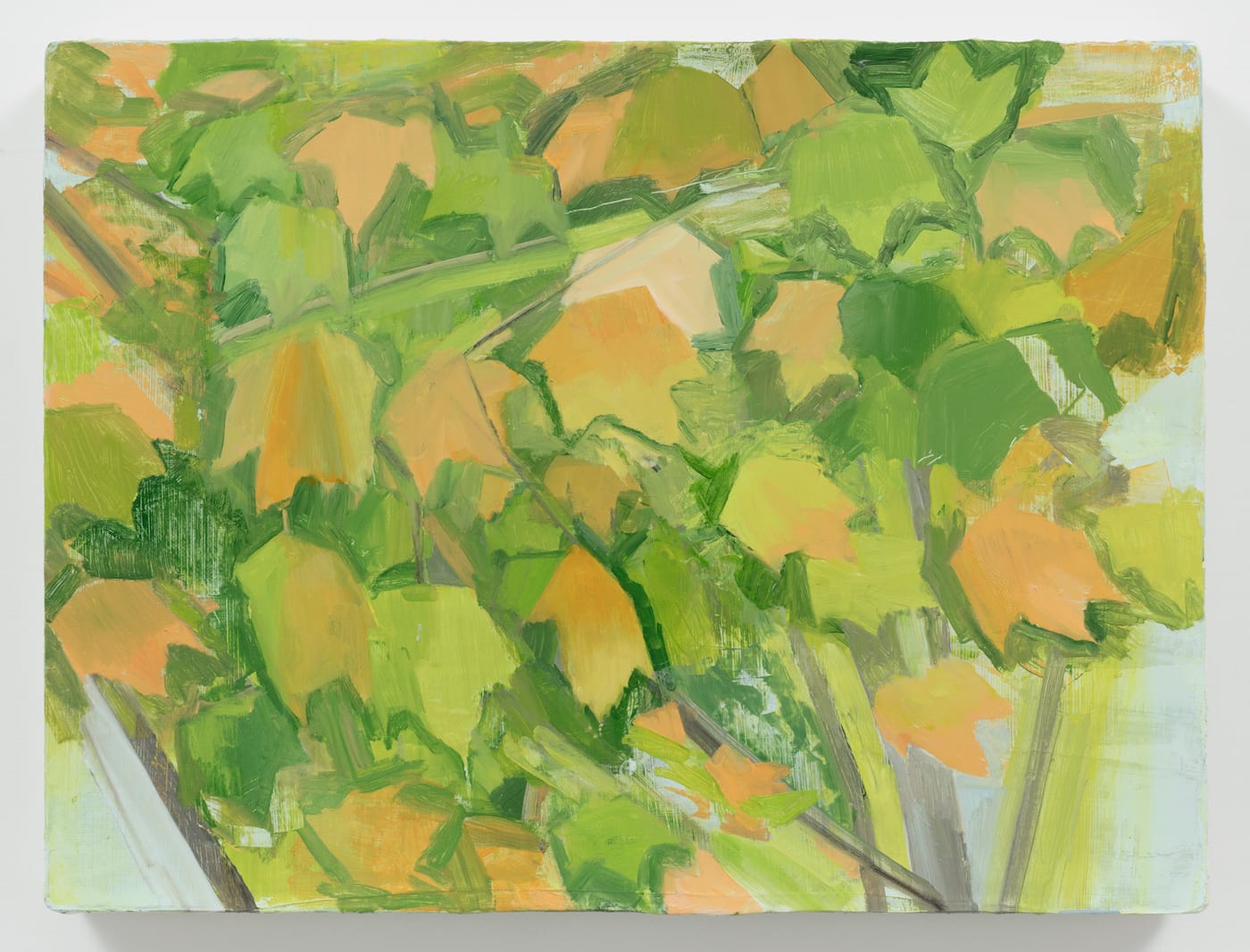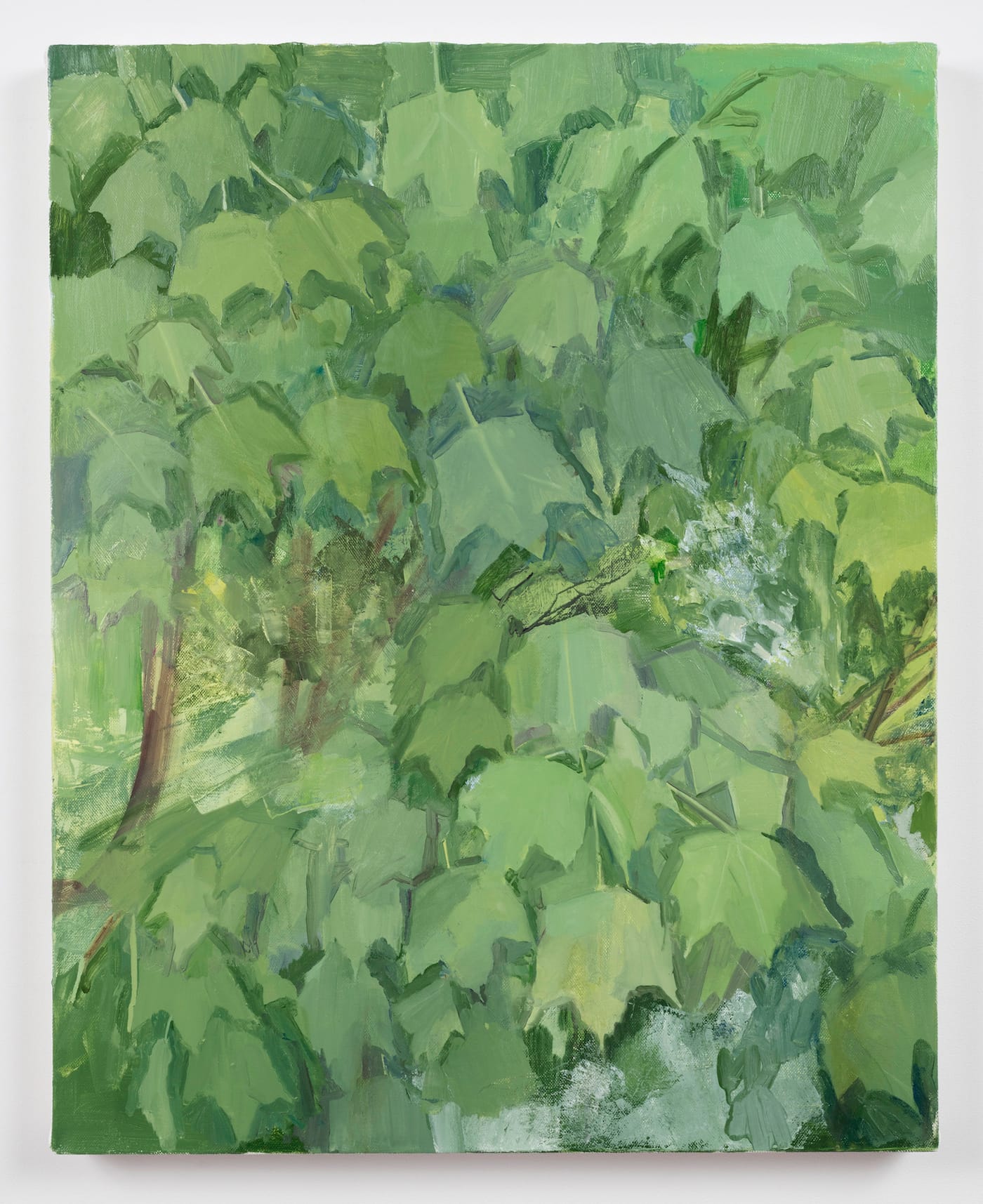 In “Summer Maple Detail” (2014), Plimack Mangold brings us even closer to the tree, clustering together many different but related hues of green. In some places, you see where she has scraped the surface. We are in a zone where the difference between representation and abstraction is beside the point: we might as well be figuring out how many angels have gathered on the head of a pin. The painting is simultaneously calm and agitated. She has brought us to that phase of intense, concentrated looking, where forms appear to be changing before our eyes, where seeing loses contact with the verbal. The artist gives us a way to lose ourselves in something all of us know. This is what Emma meant by serenity.
