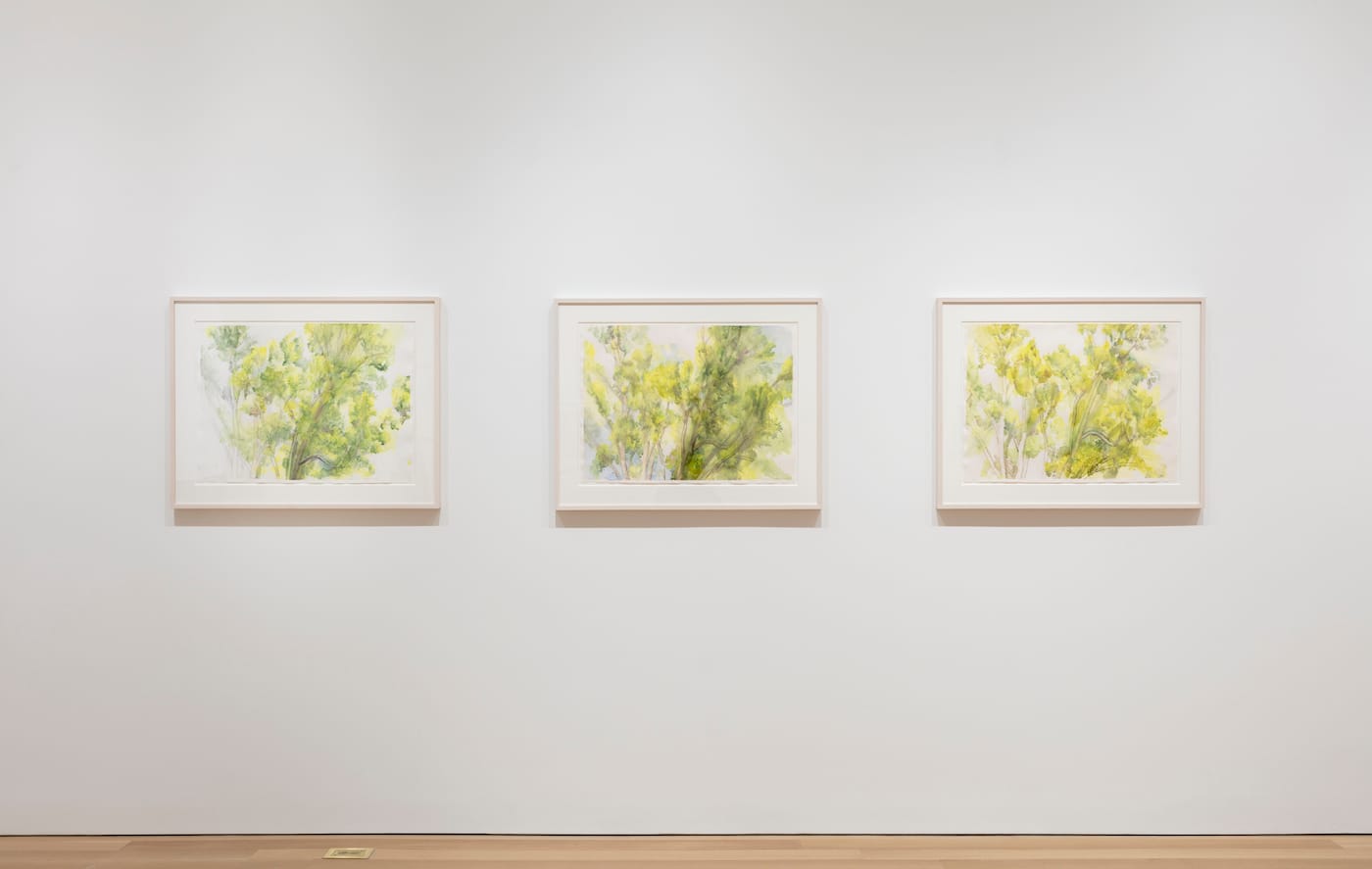 Nearby, the three graphite and watercolors of the same pin oak were all done in August 2015. In each of them, the artist returns to the same view at that point in the season when the leaves are turning yellow and many have fallen. By returning to the same motif and rendering what she is looking at — the ever-changing leaves — she marks time without calling attention to it. The plainness of her subject, the interest in observation that is inseparable from artifice (as evidenced by the framing of her subject) is about attention, a kind of devotion to the ordinary that we rarely encounter in this world.