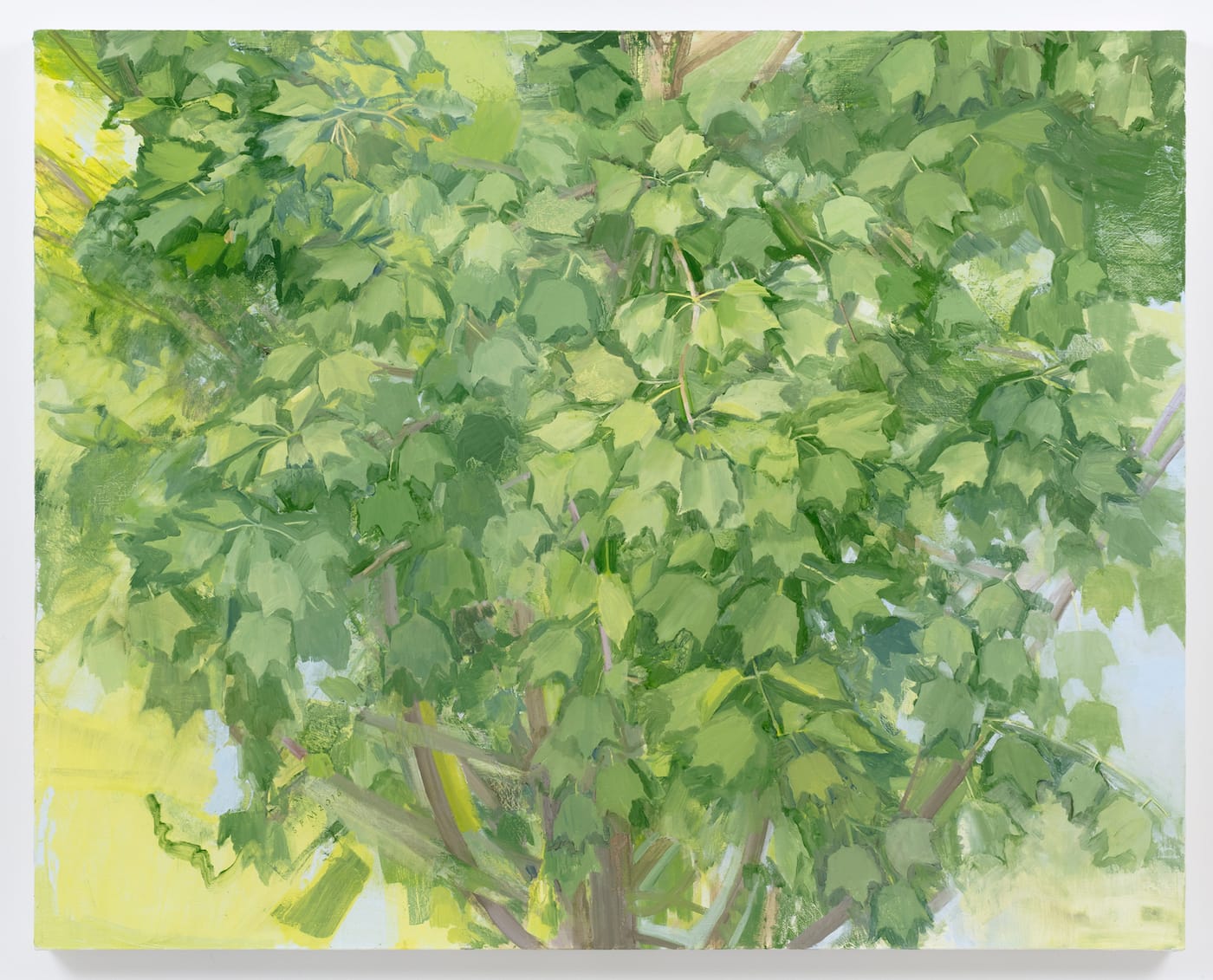 Sunlight falls on some of the leaves, while others are in the shade. The artist seems to move back and forth between delineated shapes and smears of paint, with some leaves incorporating both pictorial possibilities. This perceptual disjunction forces us never to lose sight of the fact that we are scrutinizing a painting, which takes as its subject something that we are not likely ever to stop and look at in our daily lives: layers of leaves midway up a maple tree on a summer day. This is where the artifice comes in. We have been given a direct, if cropped, view of the midsection of a tree from an unspecified height. In some profound sense, we cannot get closer to the subject, because to do so would transform it into something more generalized and abstract; nor can we step back and see the whole thing, due to the cropping, a view that is deliberately not picturesque.