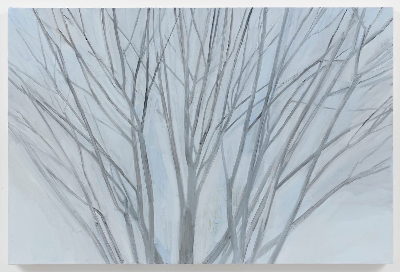 So far, I have written only about the works in the front room of the gallery, as I was in no hurry to leave them. In the second room, beyond the desk, we find the artist’s winter views: bare branches rising from the bottom edge to touch the top: another cropped view. The bare branches closest to the picture plane in “Winter Maple 2017” (2017) are painted in different hues of gray. The ones further back are faint lines of paint on the cusp of dissolving into the wintry blue-gray sky. Form giving way to light, not as a comment about the transcendent, but as a fact of observation; we cannot see it all. The views are cropped, not panoramic. We do not own the earth.
