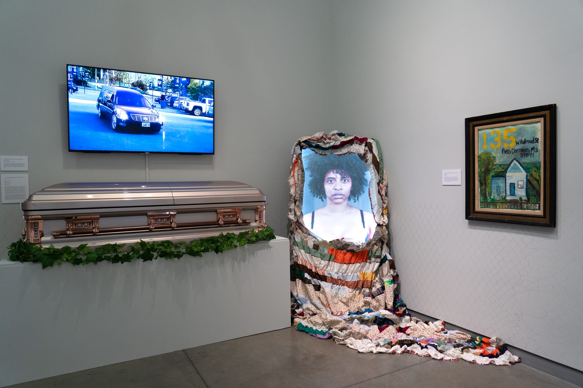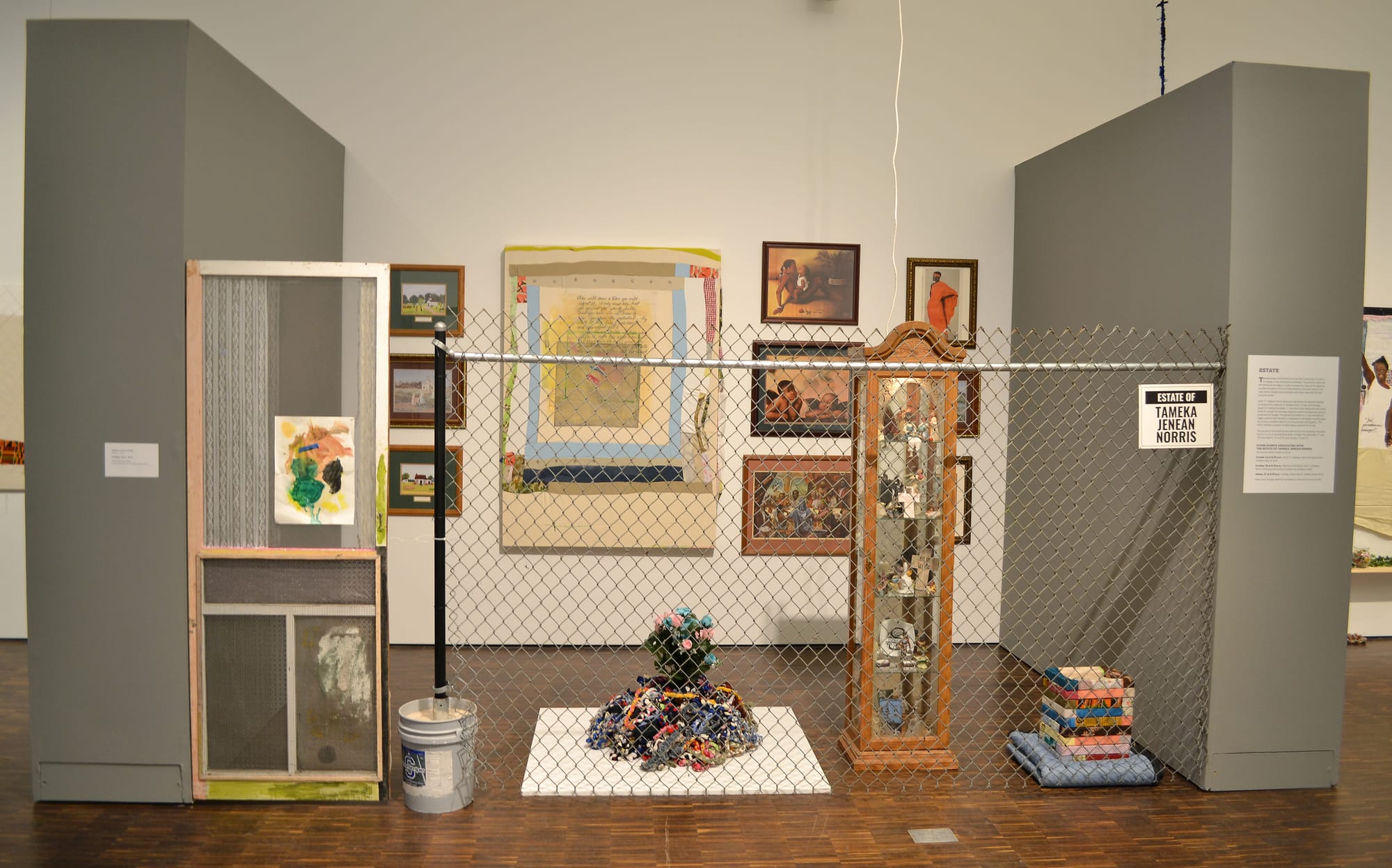 Iowa City-based artist and professor Meka Jean, hereby known as her alter-ego T.J. Dedeaux-Norris (they/them), indulges in limitless methods and materials to dissolve the imagined separations delineating identity-based dichotomies in our society. Through rap music, filmed or live performances, textile work, and curated assemblages and installations, Dedeaux-Norris peels back the layers of inherited genetic information that codifies prescribed structures of race, class, gender, and occupation. Their practice chips away at these hardened ideas and their histories, revealing an intrinsic fluidity that serves as the key to both personal and broader liberation.