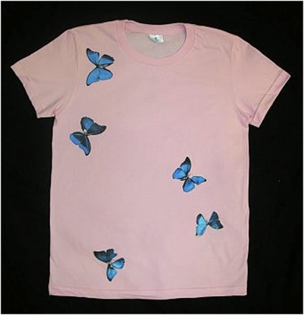 Produced in conjunction with his show Superstition at Gagosian, Hirst’s t-shirt features cerulean butterflies flitting on a soft pink background. More so than all of these, this tee most suggests sticking two armholes in an artist’s canvas and walking around in it. OK, that doesn’t sound quite as elegant as expected, but still, you know what I’m getting at.