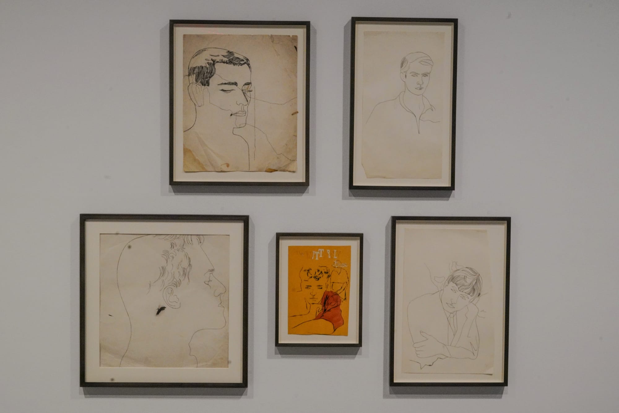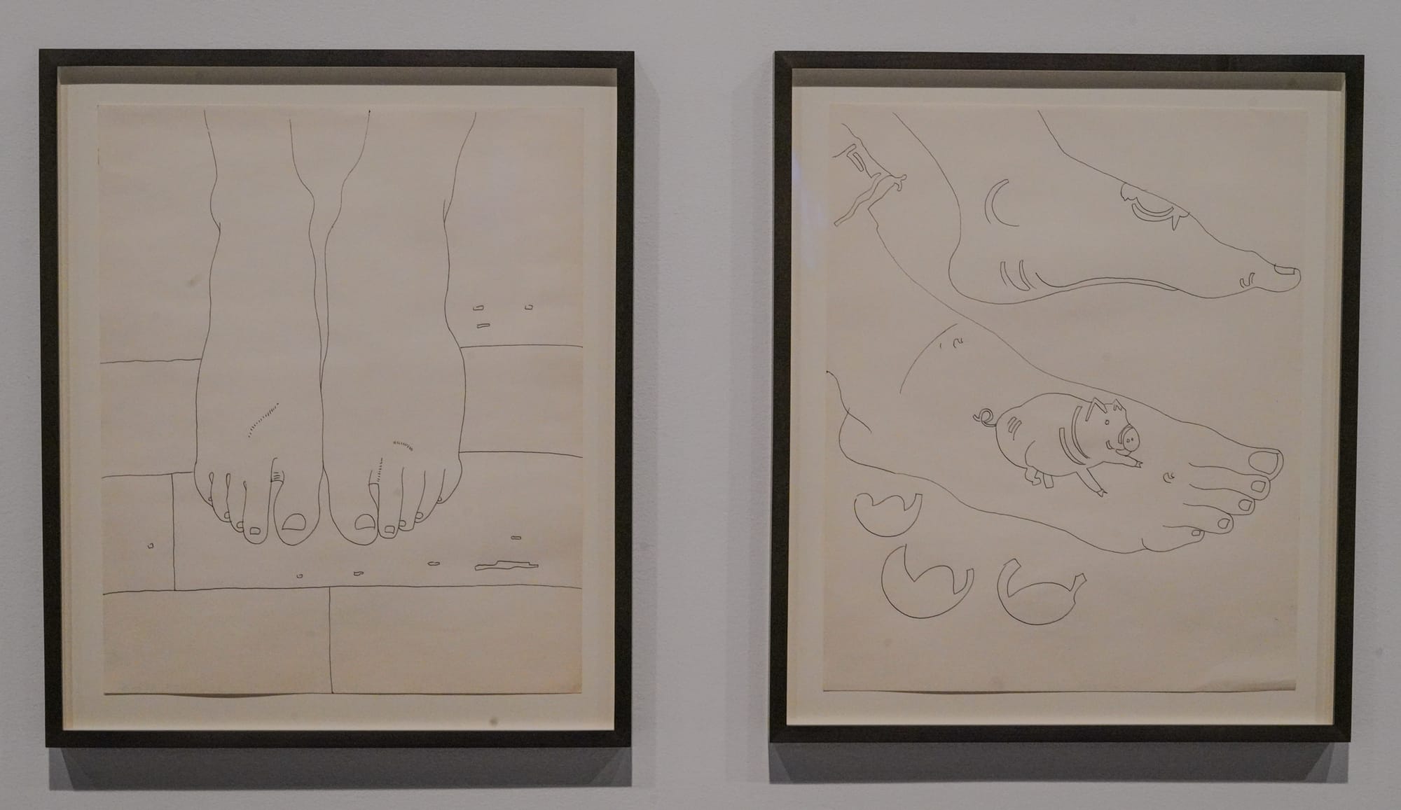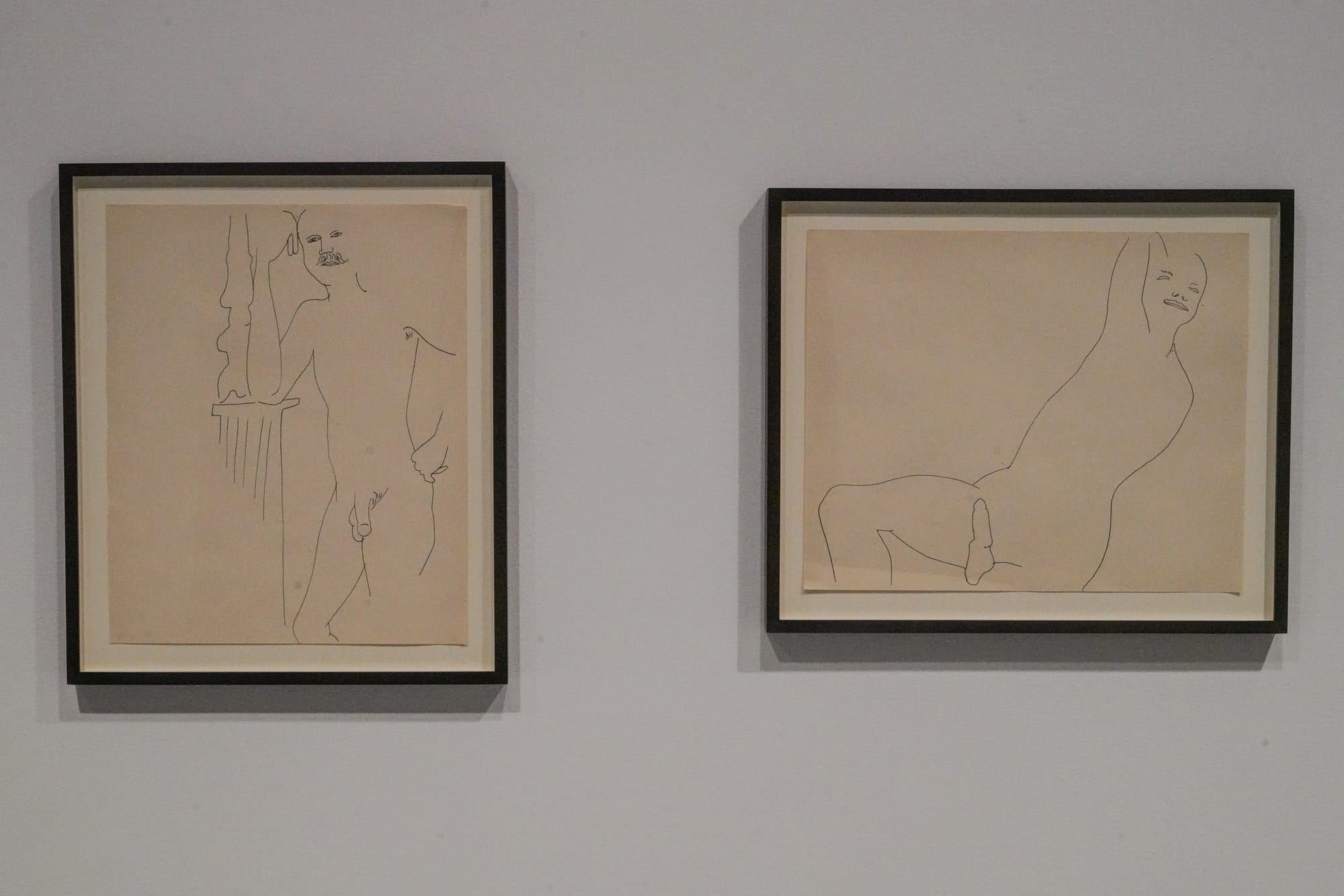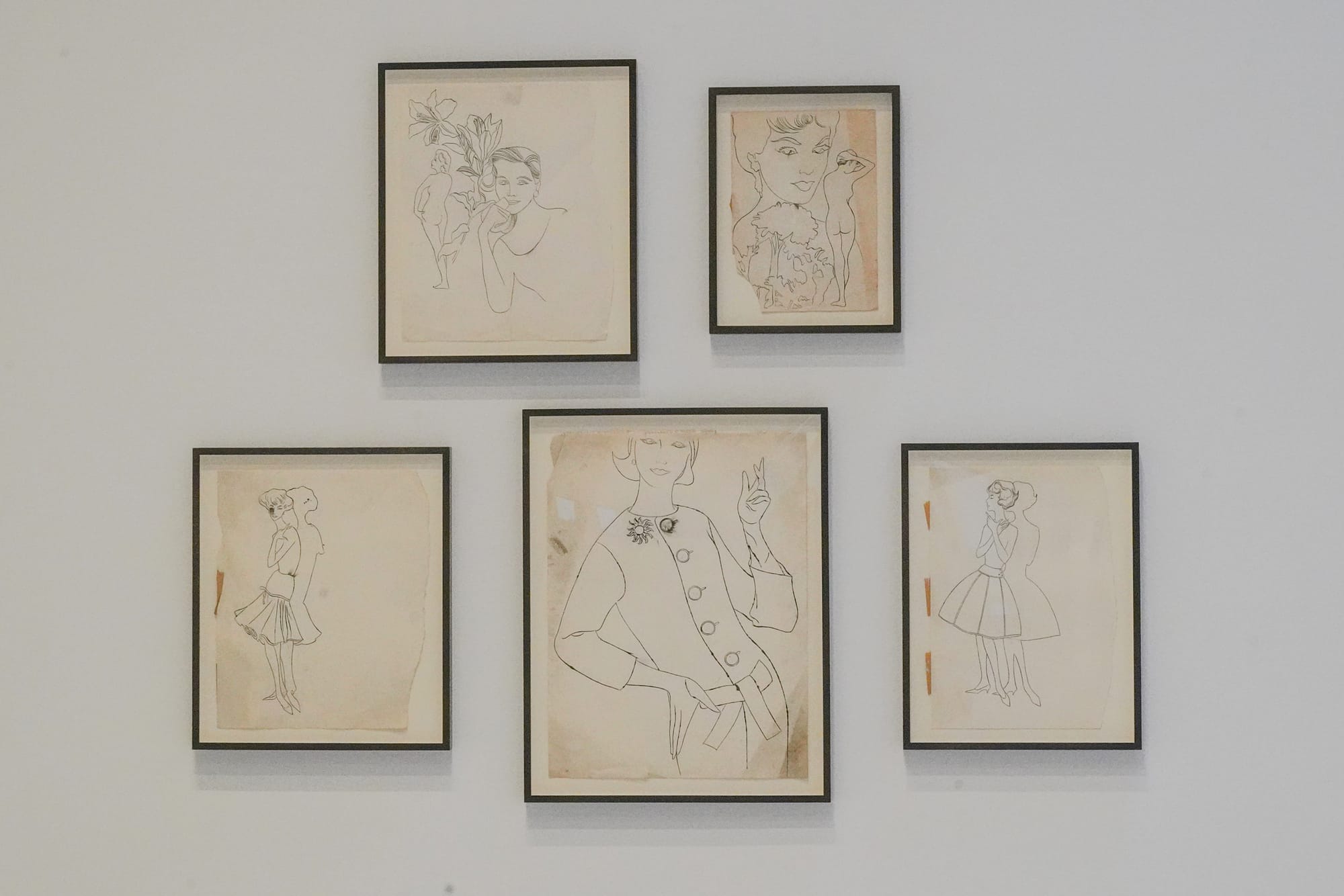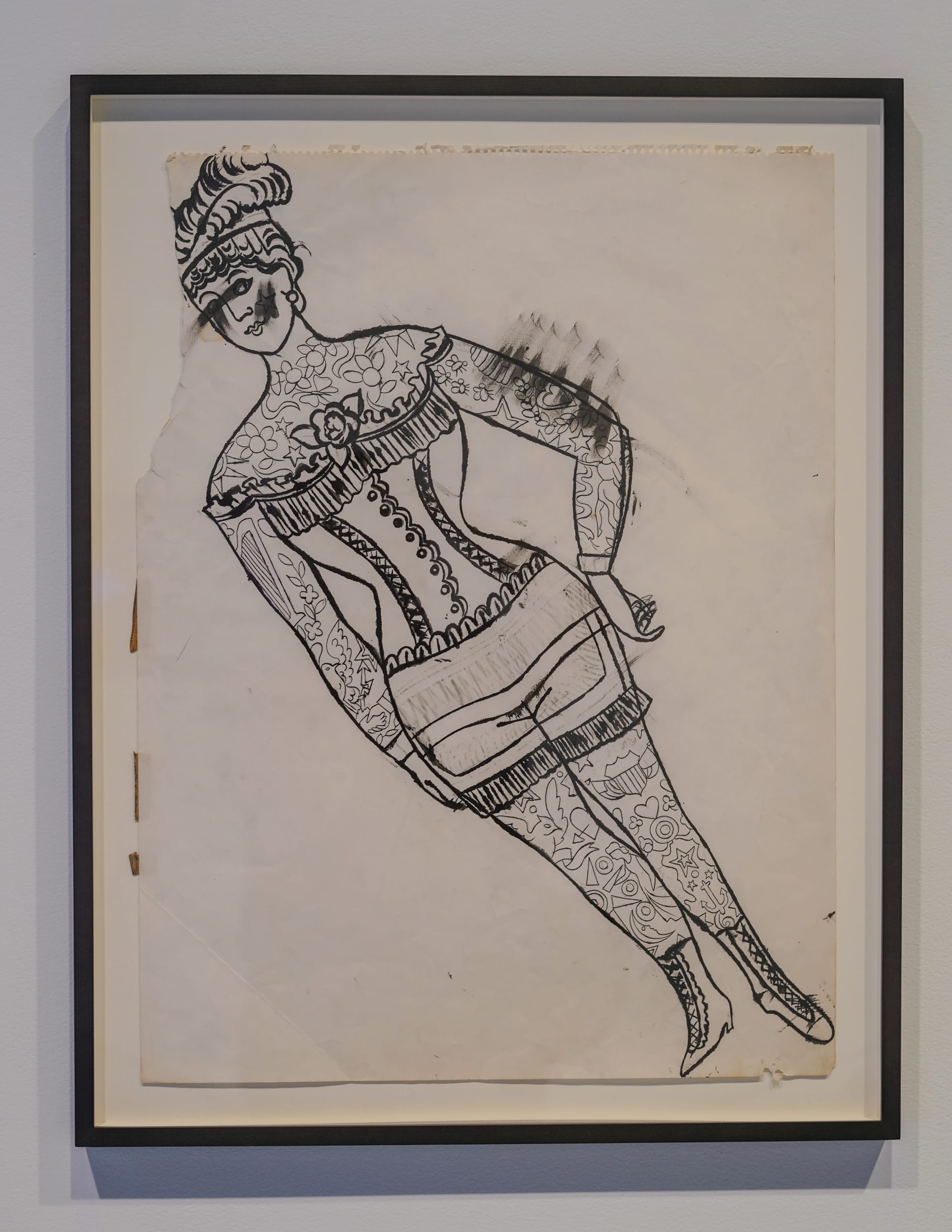 Clusters of framed ink and graphite drawings — many with cut, torn, or otherwise uneven edges — are grouped by form, and organized around the body: feminine faces, male nudes, coiffures, feet. The titles are typically straightforward and descriptive, such as “Tattooed Female In Girdle” (c. 1955) or “Male Genitals With Bow” (c. 1956). The drawings’ sensitive lines and embellished details, including flowers and butterflies and bows, add a sense of humanity, intimacy, and wit. Occasionally words join the images, with captions penned in lively cursive.