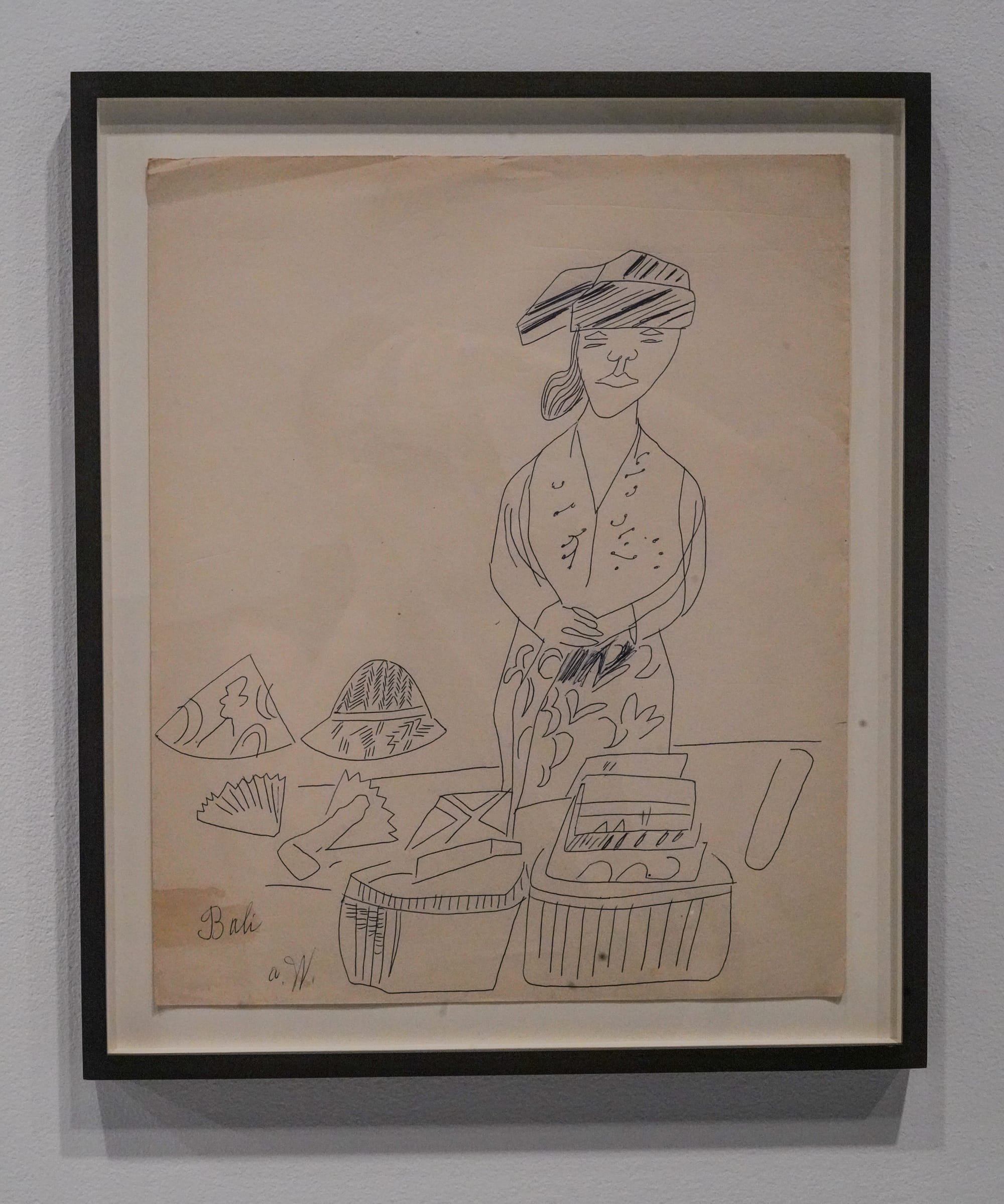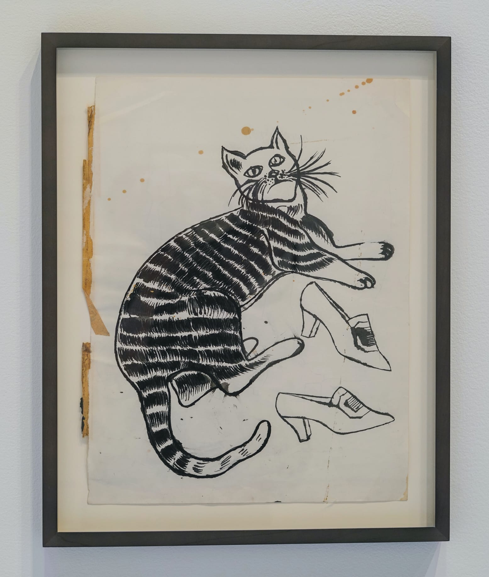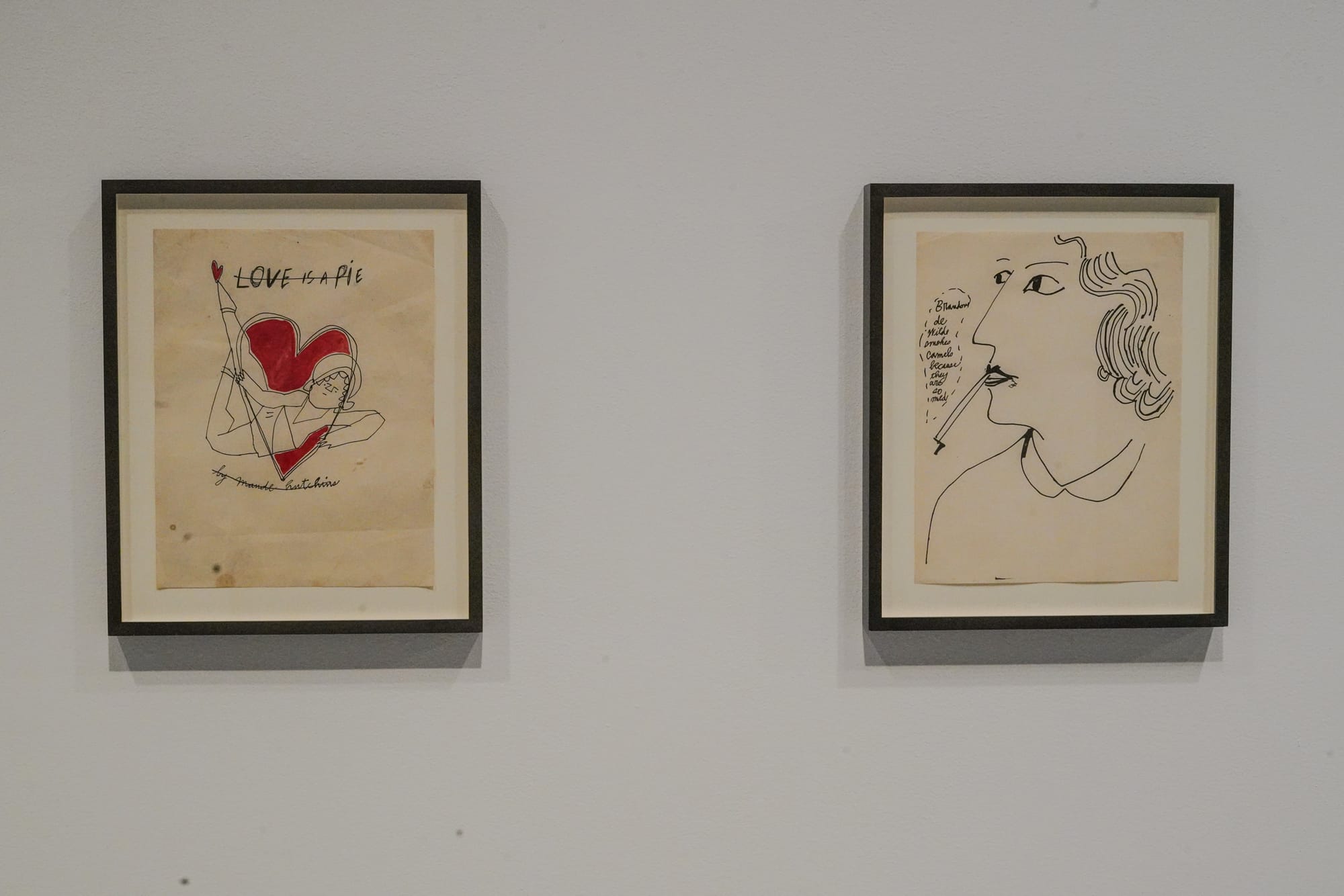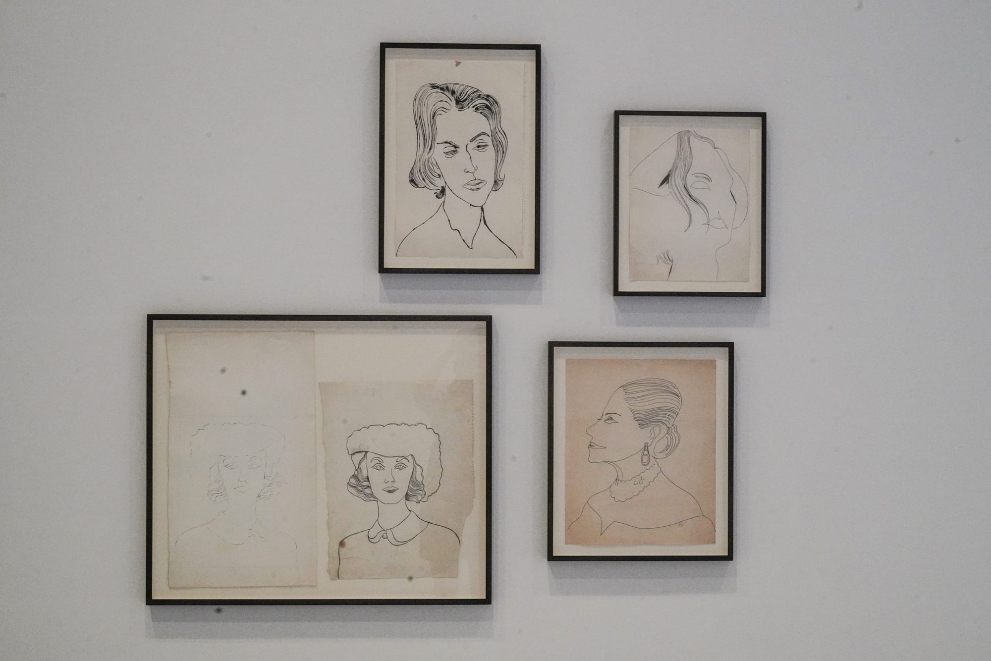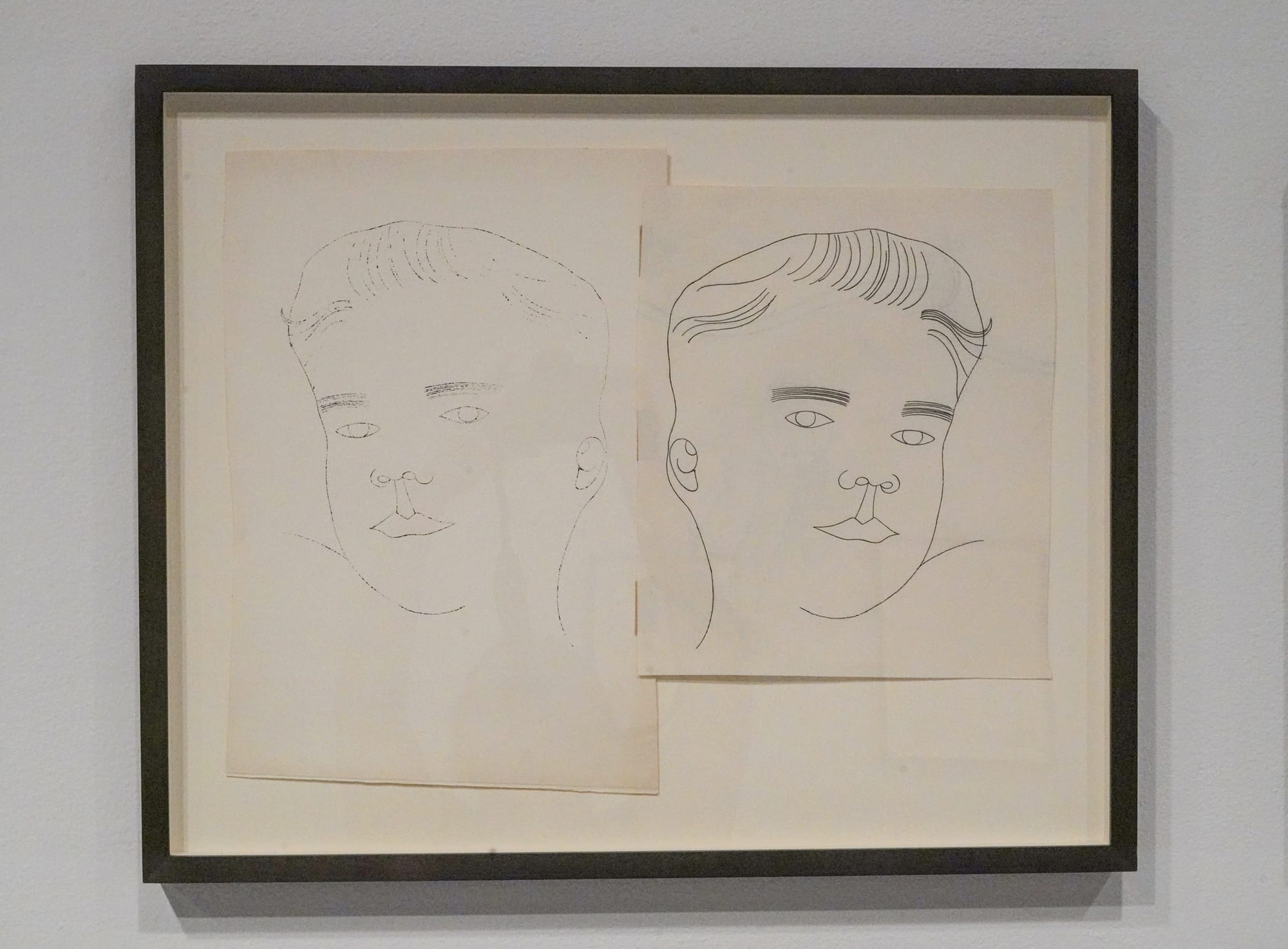 Some frames hold pairings that reveal the artist’s process. “Female Head in Flowered Hat” (c. 1957–58) and “Boy’s Head” (c. 1953), for instance, each include two mirrored drawings that show the mechanics of Warhol’s famed blotted-line technique — a basic printmaking method that involves inking a drawing and then pressing a fresh sheet of paper over the wet ink. This resulted in his perfectly imperfect lines that blob and feather, wobble and dot. Alive with analog charm, these stylish, inky lines wend through the show, beckoning us to follow and see where Warhol’s keen eye for fashion will lead next.