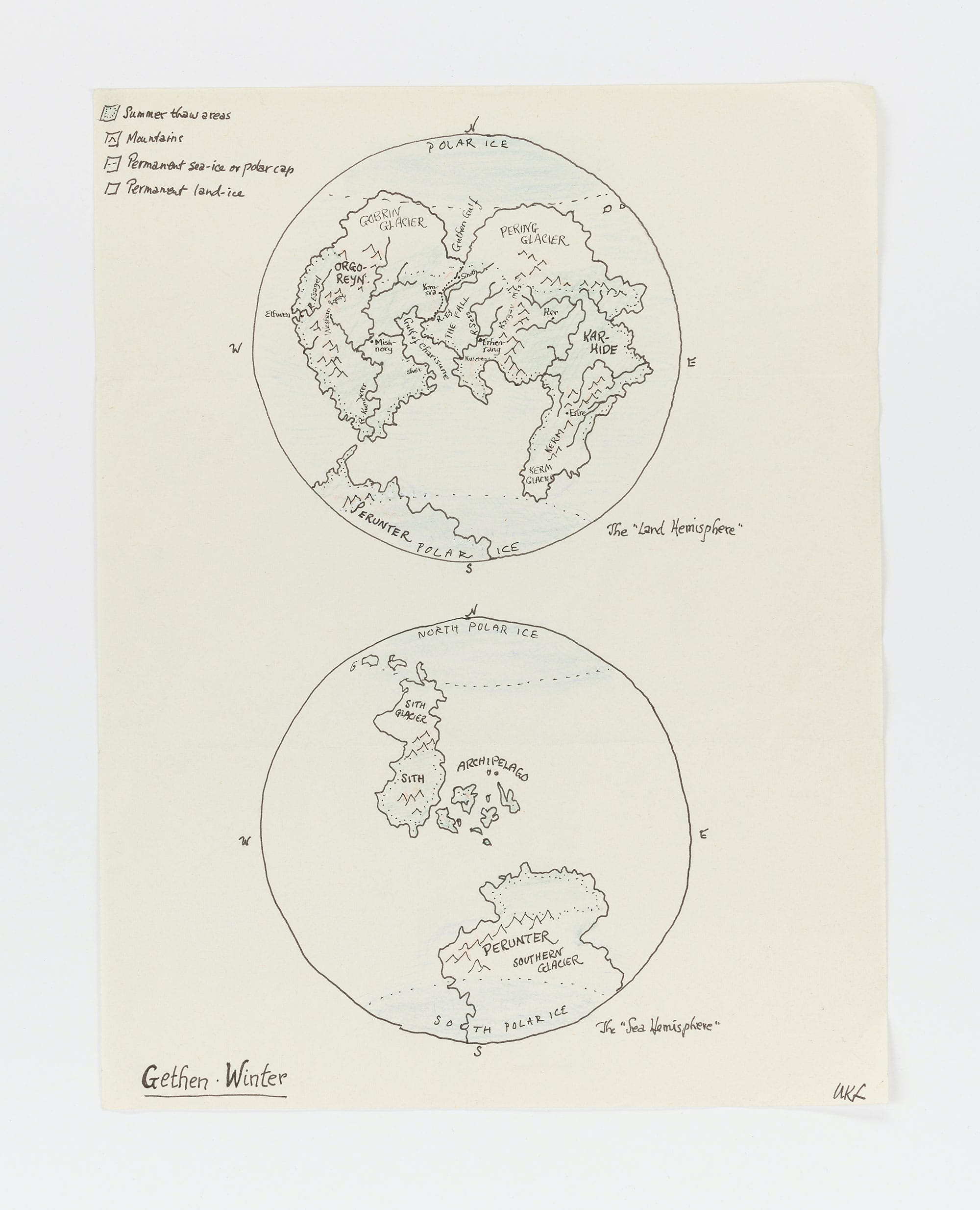 Yes, Le Guin was a map maker. That’s how she found her way into her invented worlds. After she made her maps, she proceeded to settle on them and mentally walk around inside them. If we home in on the exhibition’s maps themselves we can begin to unlock her secrets. Take, for example, “Earthsea,” an aerial view of a great archipelago of islands, several of the larger ones in a great central cluster, others frittering out in all directions of the compass. A close look at all the hand-drawn map's detail reveals a great deal of naming of particular locations: Havnor, Osskill Sea, the Inmost Sea, mountains, a small group of islands collectively known as The Torikles. It was her way into the imaginative world that would eventually end in a celebrated trilogy of novels. How did it help her? How did it show her the way ahead as a conjurer of a world that had never before existed?