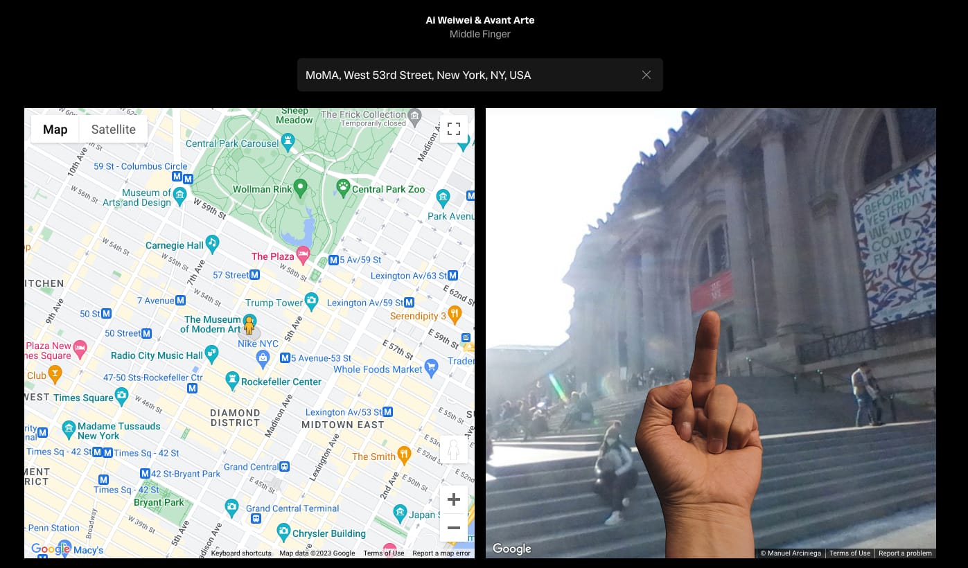 Now, you can take Ai's middle finger to virtually any place in the world (or at least anywhere that's on Google Maps) through a new collaboration between the artist and the online art platform Avant Arte. The project, Middle Finger, uses the recognizable image of Ai's hand overlaid on Google Maps street views so that users around the world can exercise the power of reinserting individuality anywhere they want.