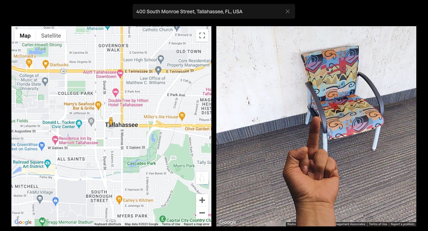 Unsurprisingly, the man of the hour, Ron DeSantis, gets a large middle finger from us. Google Maps actually brought me into the Florida Capitol building and presented me with this truly horrible but strikingly on-brand chair in a hallway that I chose to vent my frustrations into. Just this week, DeSantis announced that he was looking into revoking the liquor license of a Hyatt Regency hotel in Miami for hosting sexually explicit live entertainment with children present last Christmas. The live entertainment in question? A drag show, to no one's surprise. This is but another brick in the wall DeSantis has built to suppress any "wokeness" from indoctrinating the children of Florida. Desantis is also known for his crackdown on the infusion of Critical Race Theory and Diversity, Equity, and Inclusion in Florida school curriculums, causing teachers and librarians to strip thousands of now-banned books from the shelves that suggest even a modicum of diversion from the White heteronormative status quo.