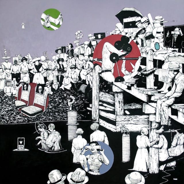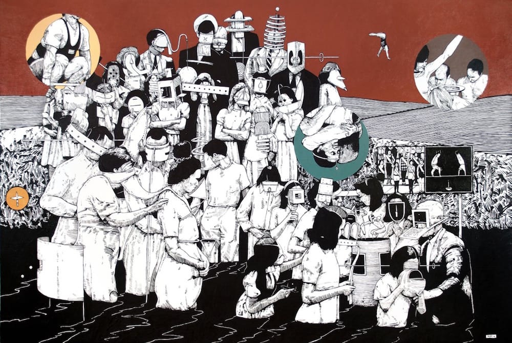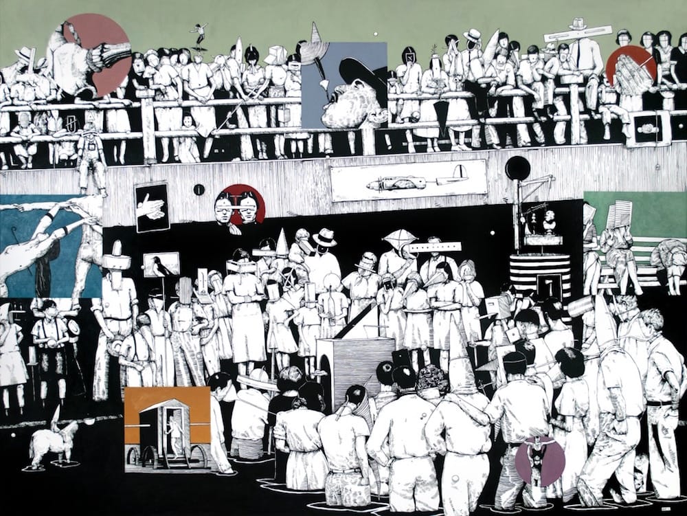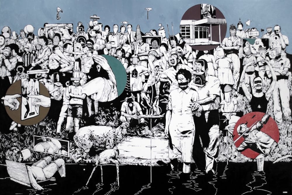 Painted in acrylic, the figures are rendered in the artist’s characteristic high-contrast black-and-white, as if they were pen and ink drawings, while the stretches of sky above the crowds, as well as the negative spaces of the numerous pictorial inserts (reiterations of the comic-book stylings in Buchina’s previous work), are done in flat, poster-like monochrome. The consistency of theme and approach contribute to a cinematic sweep from canvas to canvas — a long tracking shot shifting slightly in perspective and scale as the action moves from the riverbank to a rotting dock to a two-tiered concrete structure built against the water’s edge.