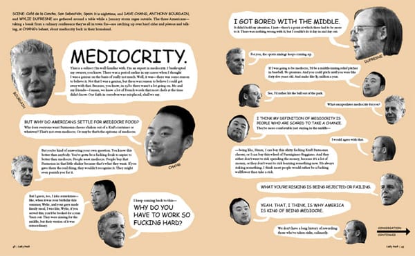 Which makes sense, given the players involved: The project was conceived by Momofuku’s David Chang and former New York Times writer (and co-author of the Momofuku cookbook) Peter Meehan, and has support from Zero Point Zero Production, the producers of “Anthony Bourdain: No Reservations.” Lucky Peach is published by McSweeny’s, the San Francisco-based house behind such literary titles as McSweeny’s Quarterly Review and The Believer, which characteristically feature illustrations as interludes to long-form essays in interviews.