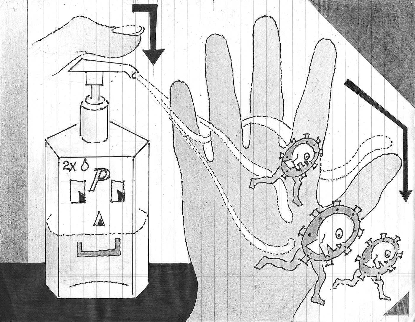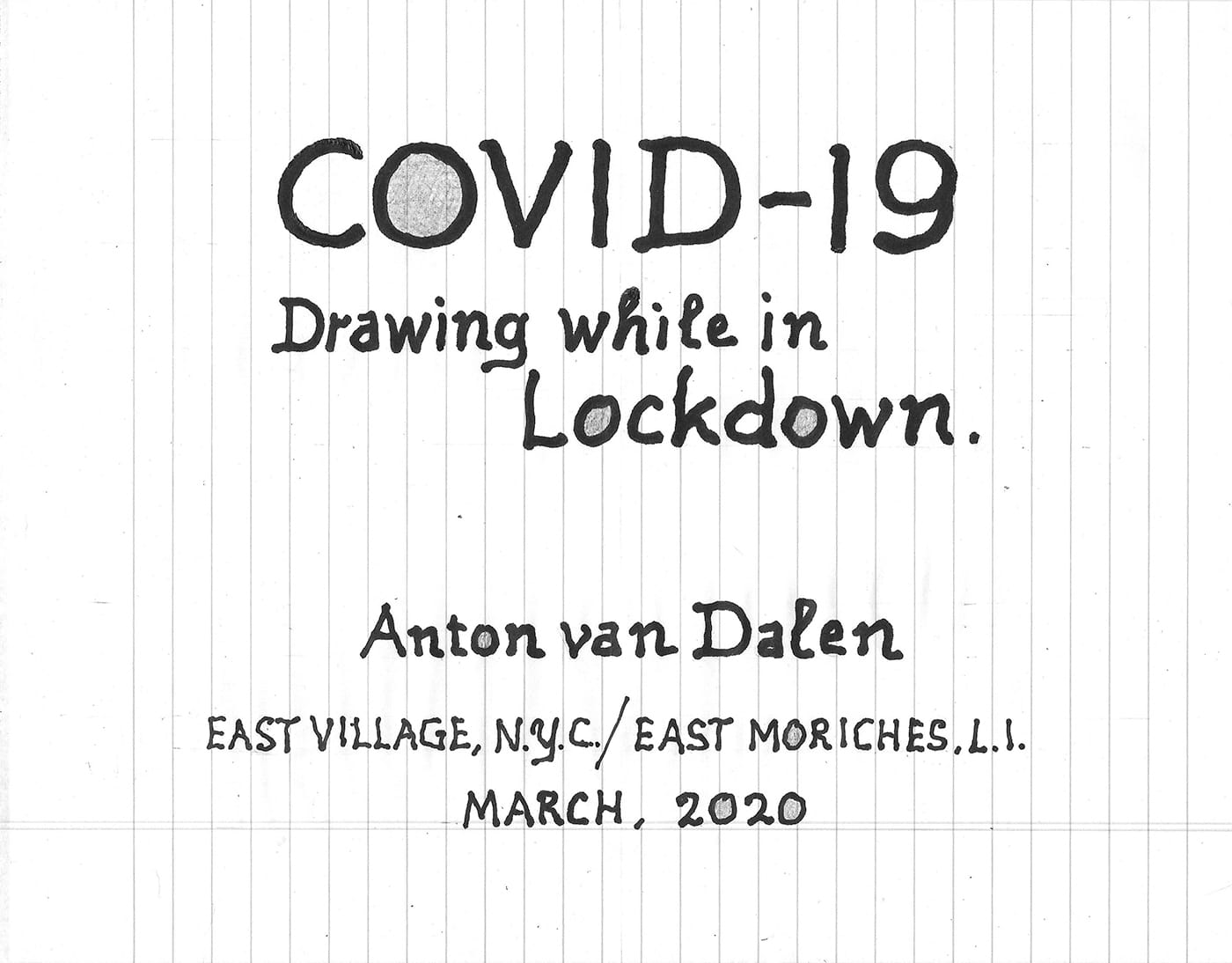 A diarist by nature, van Dalen has been making daily drawings collectively titled COVID-19, Drawing While in Lockdown. All the drawings are done on sheets of blue-lined white paper, with the first one dated “Wed. March 18, 2020.”