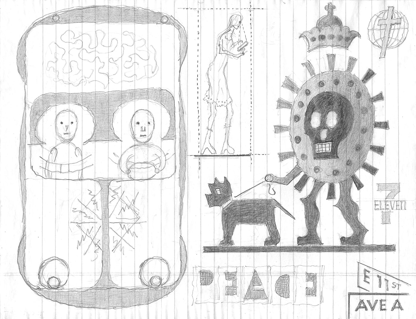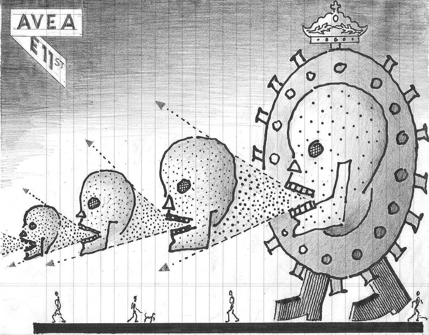 Then the Coronavirus / Covid-19 blew up and unleashed its poisonous cloud everywhere. At once my hesitation vanished, the subject found me, our entire fragile world of today. Have always worked from the perspective of starting with home, then street, neighborhood, city, world. We came to learn that Covid-19 envelops every dimension of our personal and public life. It rudely stirred up my still scarred emotional childhood memories, most of Holland WW2. As military language has come to be used more and more to describe our naked vulnerabilities, I wanted my visuals to center on the East Village, began my drawings at my Avenue A home. But then my children and friends thought, because of my age at 81, I should get out of the city. I came to understand that I should listen to my children and retreat to the countryside of Long Island. Through their generosity I was able to turn my scribbles into accessible drawings.