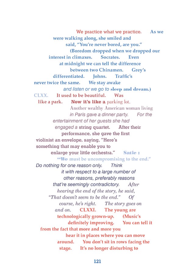 The result is a work in which the visual dimension has become as multifaceted as the textual one, making Cage the posthumous collaborator on an artist’ book, which seems appropriate, since for Buddhists the results of one’s actions continue long after death. Nevertheless, even chance has its structural limits, and readers of Cage texts such as Silence: Lectures and Writings (1961) or his experiments with poetry will find the look and shape of Diary familiar: a somewhat centered text composed of fragments snaking down the page. Here’s section 170 from part 6, laid out in brown, darker brown, gray, blue and lighter blue, and in a variety of fonts: