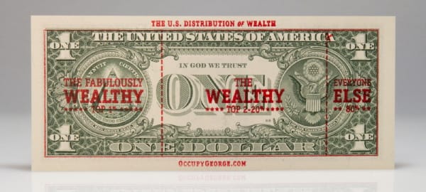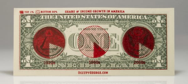 Money talks, but not loud enough for the 99%. By circulating dollar bills stamped with fact-based infographics, Occupy George informs the public of America’s daunting economic disparity one bill at a time. Because money knowledge is power.