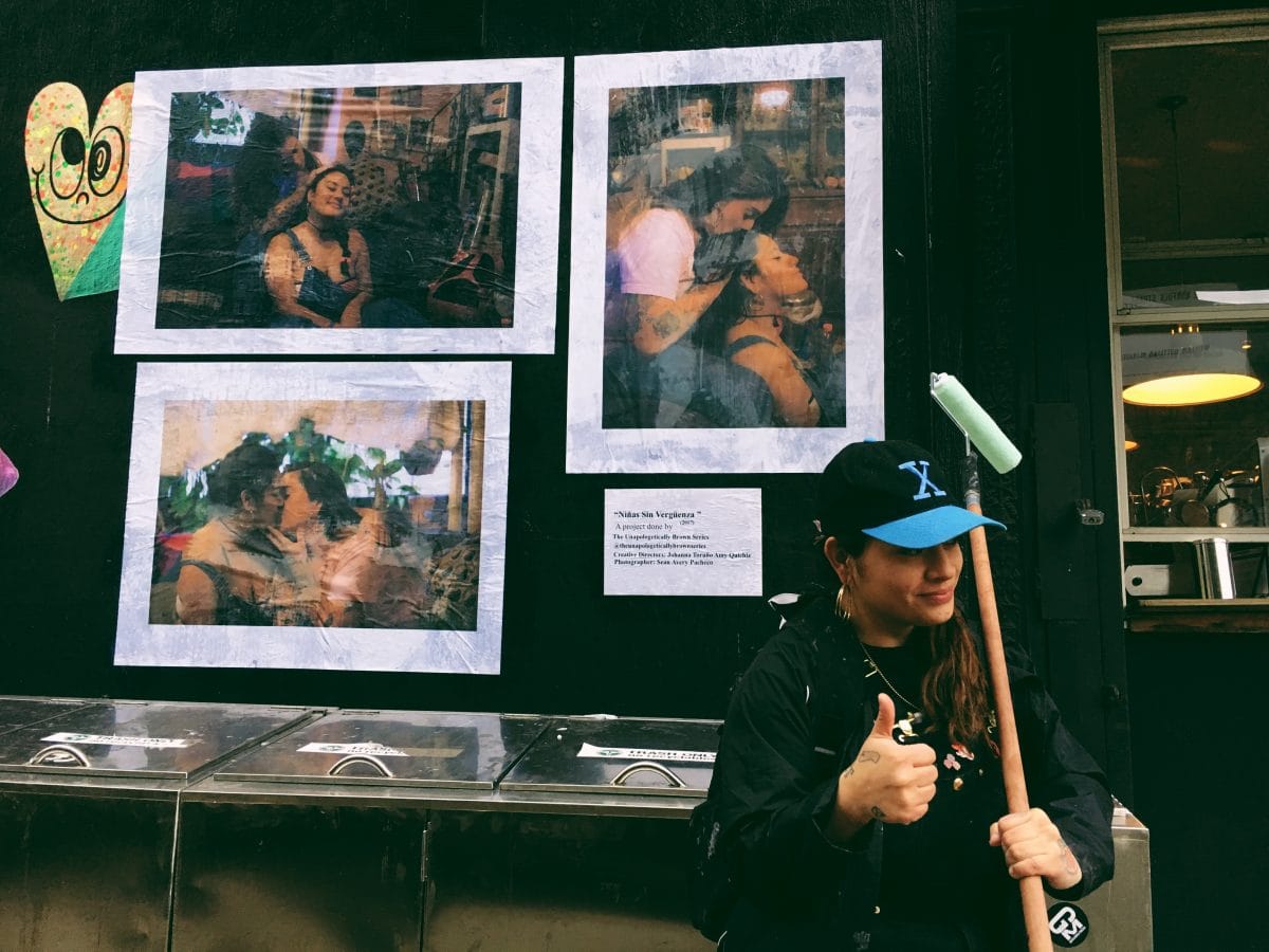 In 2017, while living in New York City, she created Niñas Sin Vergüenza, a poster series showing her photographed with her girlfriend, Amy Quichiz, which she printed and pasted around the Lower East Side. The three-part series pictures moments of affection: the couple kissing each other on the lips, on the head, touching each other — always looking at each other and not at the camera. By the very nature of their existence, the images are both intimate and bold; they stake a claim for being not just queer and Salvadoran, but queer and migrant too, in plain view. “I created a way to decorate those walls with large posters of queer people of color [...], and by doing so, [I am] simultaneously playing my part and recreating the lens of street art,” she said in a TED talk given in February 2020 on Queer Visibility and Public Art. “Queer folks don't usually grow up with overflowing examples on how to simply exist.”