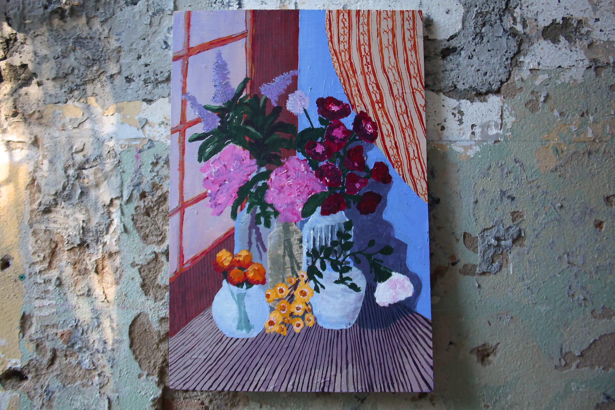 Sus pinturas, naturalezas muertas de flores y frutas dispuestas en composiciones similares a las de Van Gogh y representadas en suaves tonos tropicales, son "mi exploración de la feminidad, una forma en que puedo procesar mucho dolor profundo a través de la delicadeza de la pintura", dijo. “La práctica de hacer arte es en sí misma un comentario y una rebelión contra las actitudes patriarcales del machismo que se sentían prevalecientes en mi cultura”.