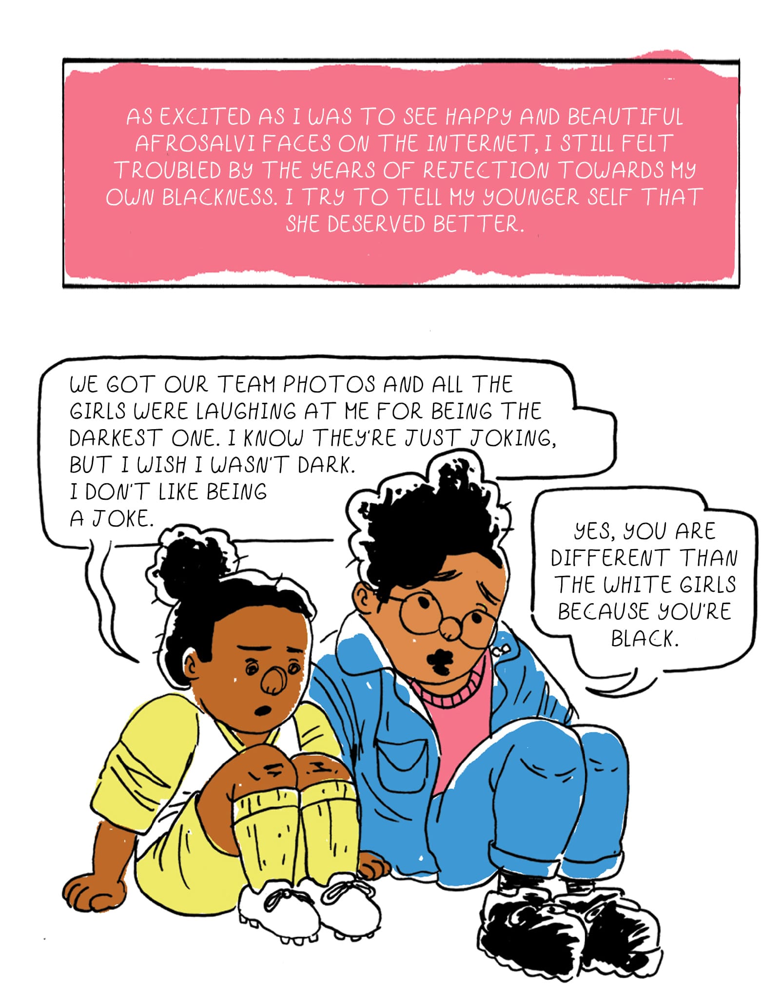 Meanwhile, for Nuñez, a genderqueer comic artist in the Bay Area, their comics and illustrations center their identity as Afro-Salvadoran on their father’s side and Guatemalan on their mother’s side. In 2013, they created Colocha-head, a zine they describe as a starting point for unpacking their journey towards understanding Blackness in El Salvador, while also recalling moments of colorism and anti-Blackness within their culture. “I was really curious about why I was bring perceived and read as Black, when people had been saying ‘no hay negros en El Salvador’ (there are no Black people in El Salvador) for a really long time,” they said.