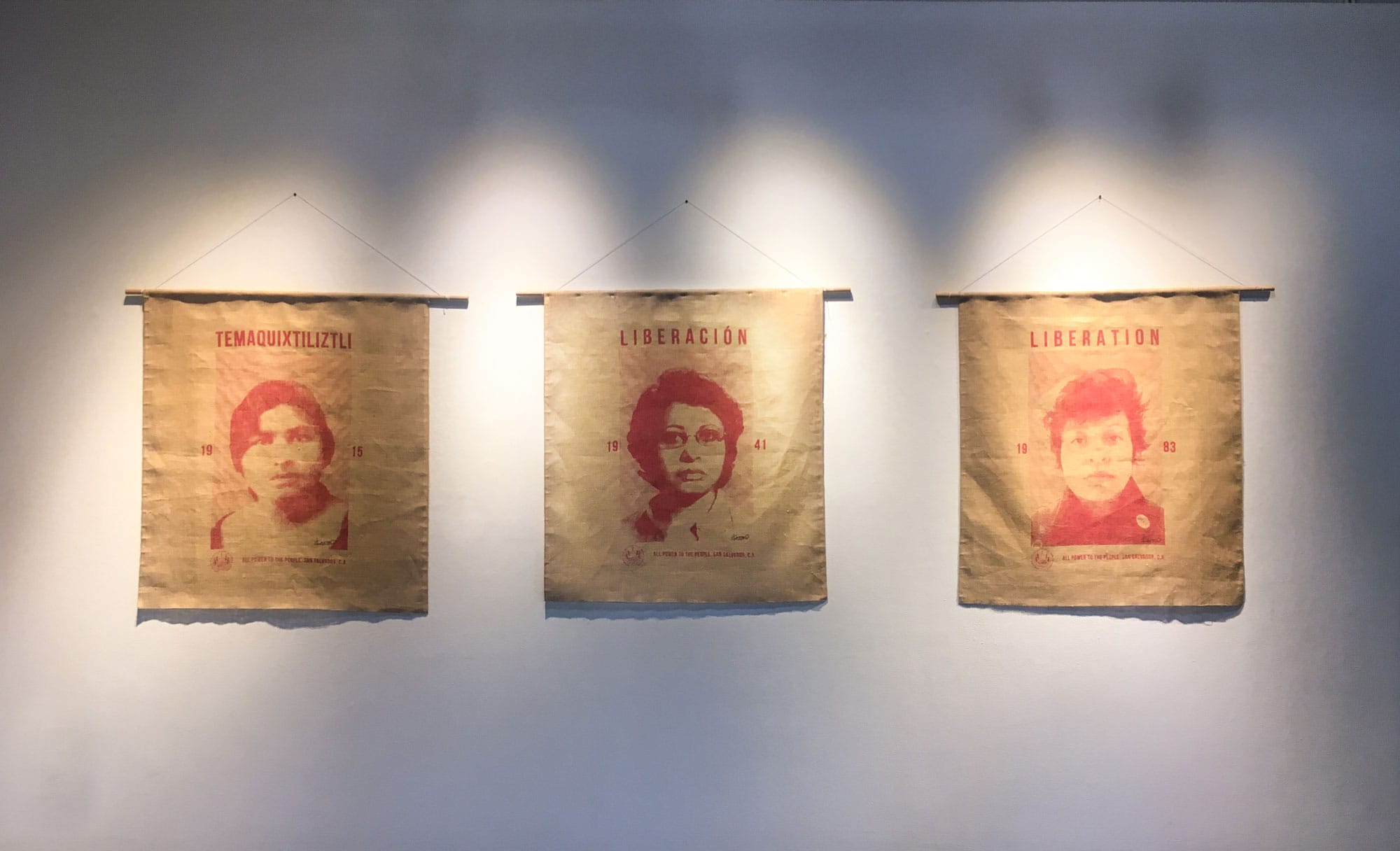 In 2019, the Salvadoran artist and designer Lilliana Castro, who currently lives in LA, showed her work “Temaquixtilitzli,” as part of the group exhibition ¡Chévere!, organized by Salvies Who Lunch. Silk screened by hand on burlap panels, the triptych features portraits of Castro, her aunt Teresa de Jesus, and her grandmother Narcisa Zavaleta Barrera. To make each portrait, she created multidirectional layers of red ink mimicking the way currency is printed, with each woman's face rendered like an apparition on the cloth. Above their heads are the words Temaquixtilitzli, Liberación, Liberation— the Nawat, Spanish, and English words for liberation, respectively.