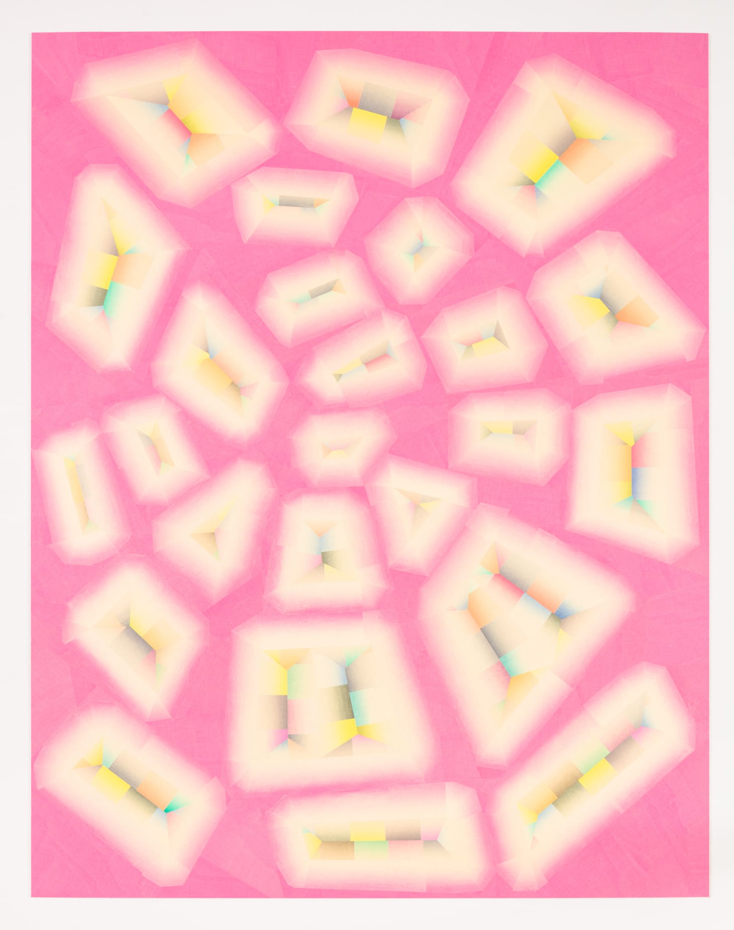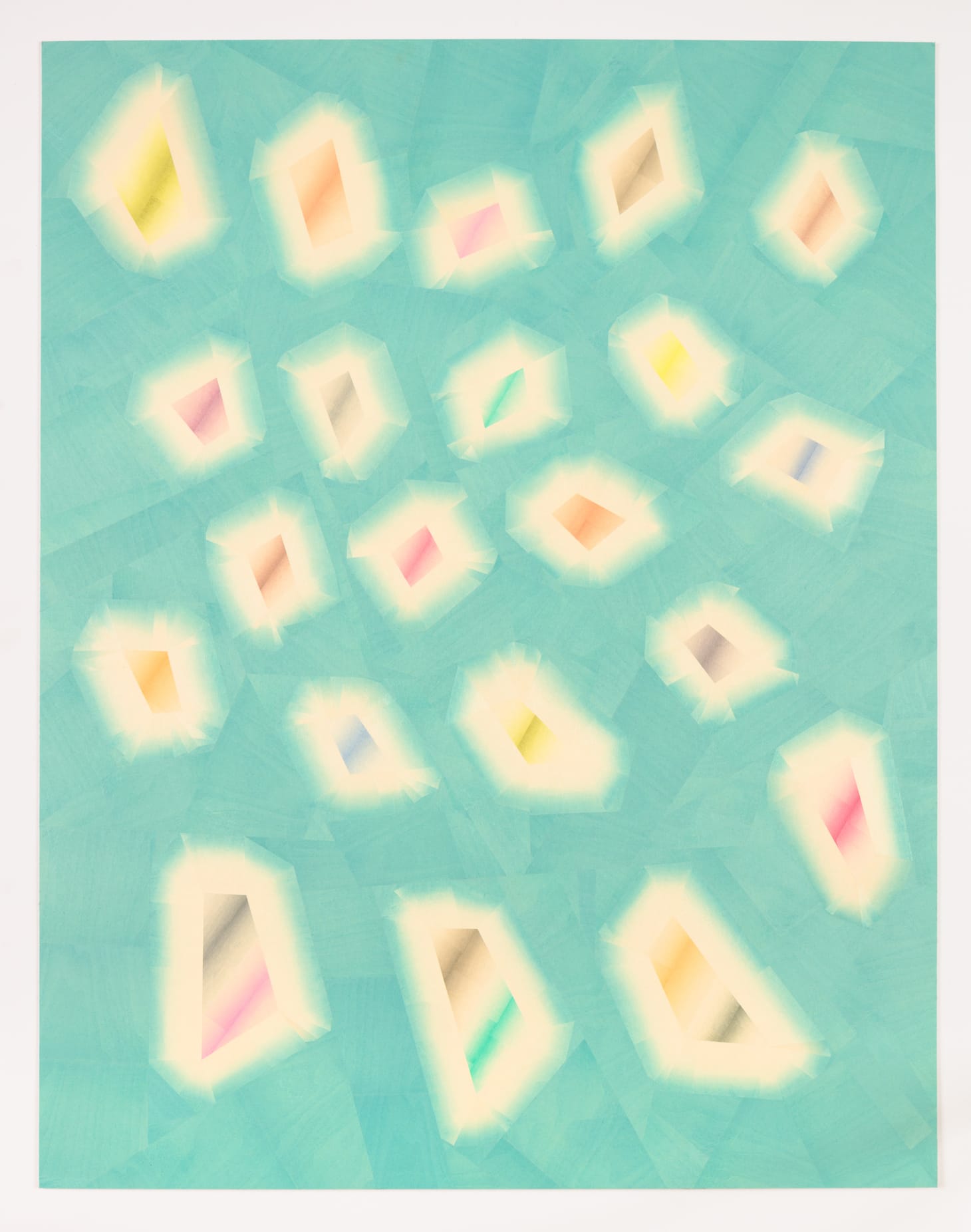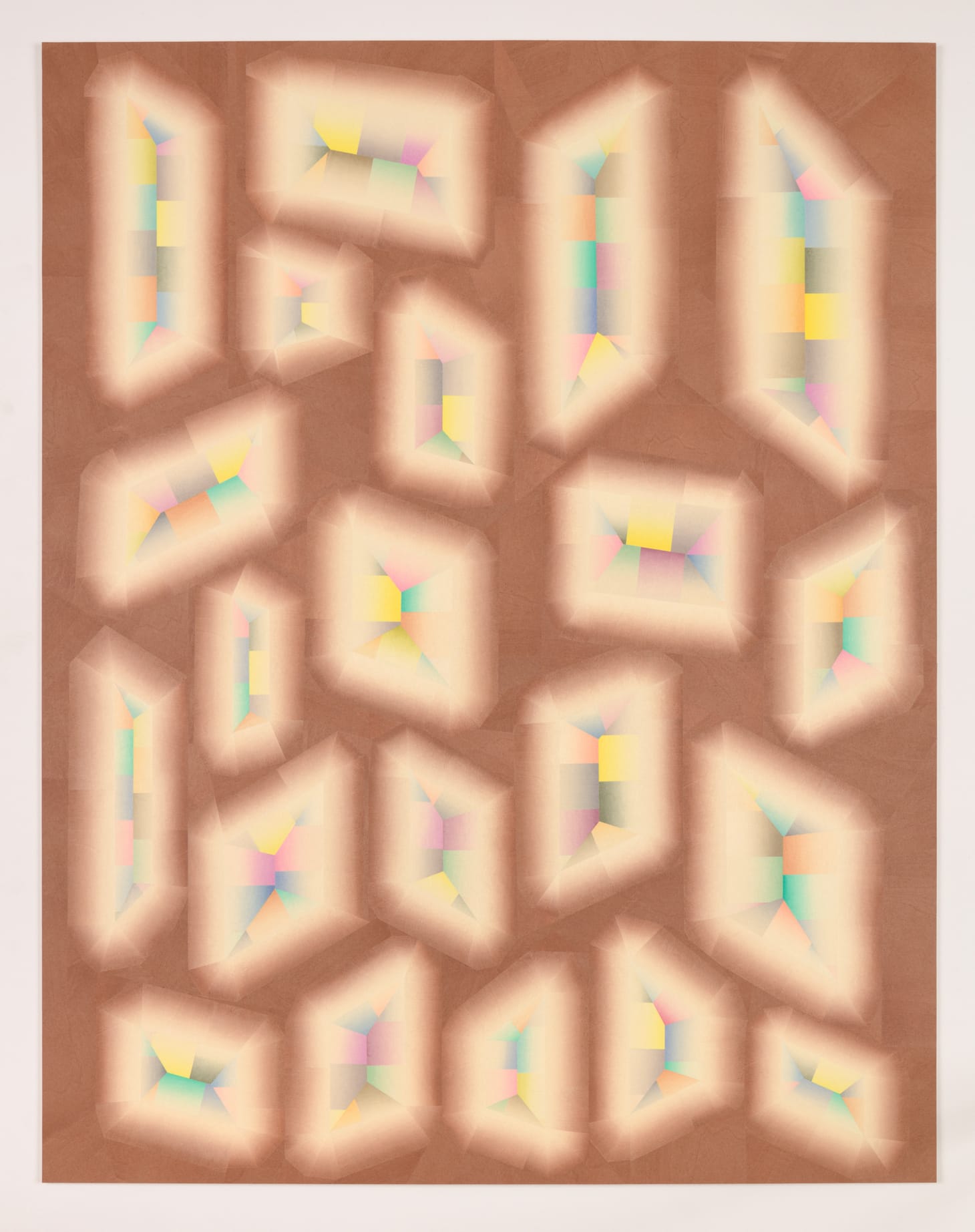 In “Caramelized Memory” (2020), different-sized, fuzzy-edged quadrilaterals, which suggest rounded edges, are suspended in a caramel-colored field. Each of the quadrilaterals contains sections of gradated color (green, pink, yellow, orange, gray-blue) fit together in the center, surrounded by a gradated band that goes from faint at the edges to a faded, ghostly caramel. The result is mesmerizing and unsettling, like a memory that is haunting and elusive.