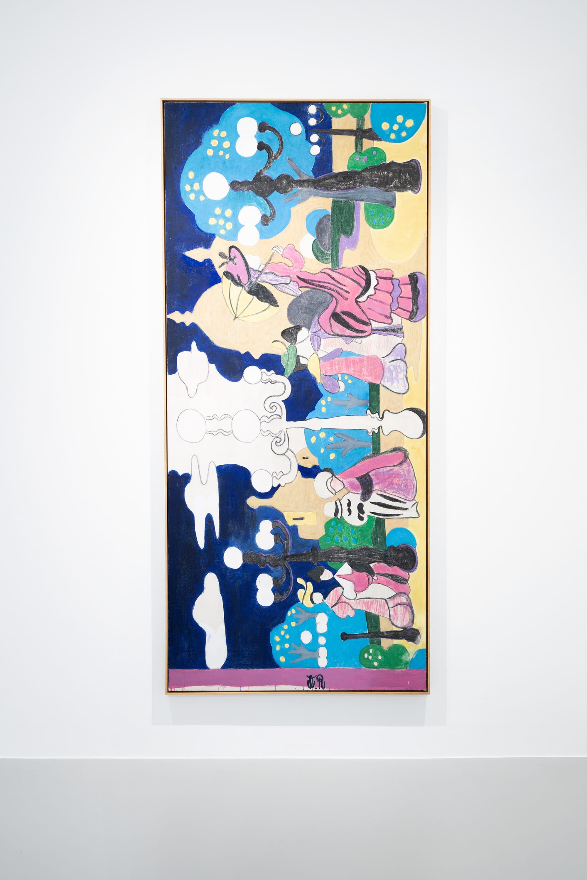 “Promenade” (2014), the first painting one sees when entering the gallery, is one of these works. It is evocative of Fauvism, in its bright, expressive color and portrayal of women with parasols in early 20th century dress, out for a walk in the park, and hangs at 96 inches tall. But, my mind insisted, in order for the horizontally oriented figures to stand upright, the painting needs to rotate 45 degrees clockwise. At first, this struck me as a gimmick, because the work seemed so indebted to earlier art movements. I tilted my head to the left and looked at the painting some more. I wavered between a laugh and a “what?
