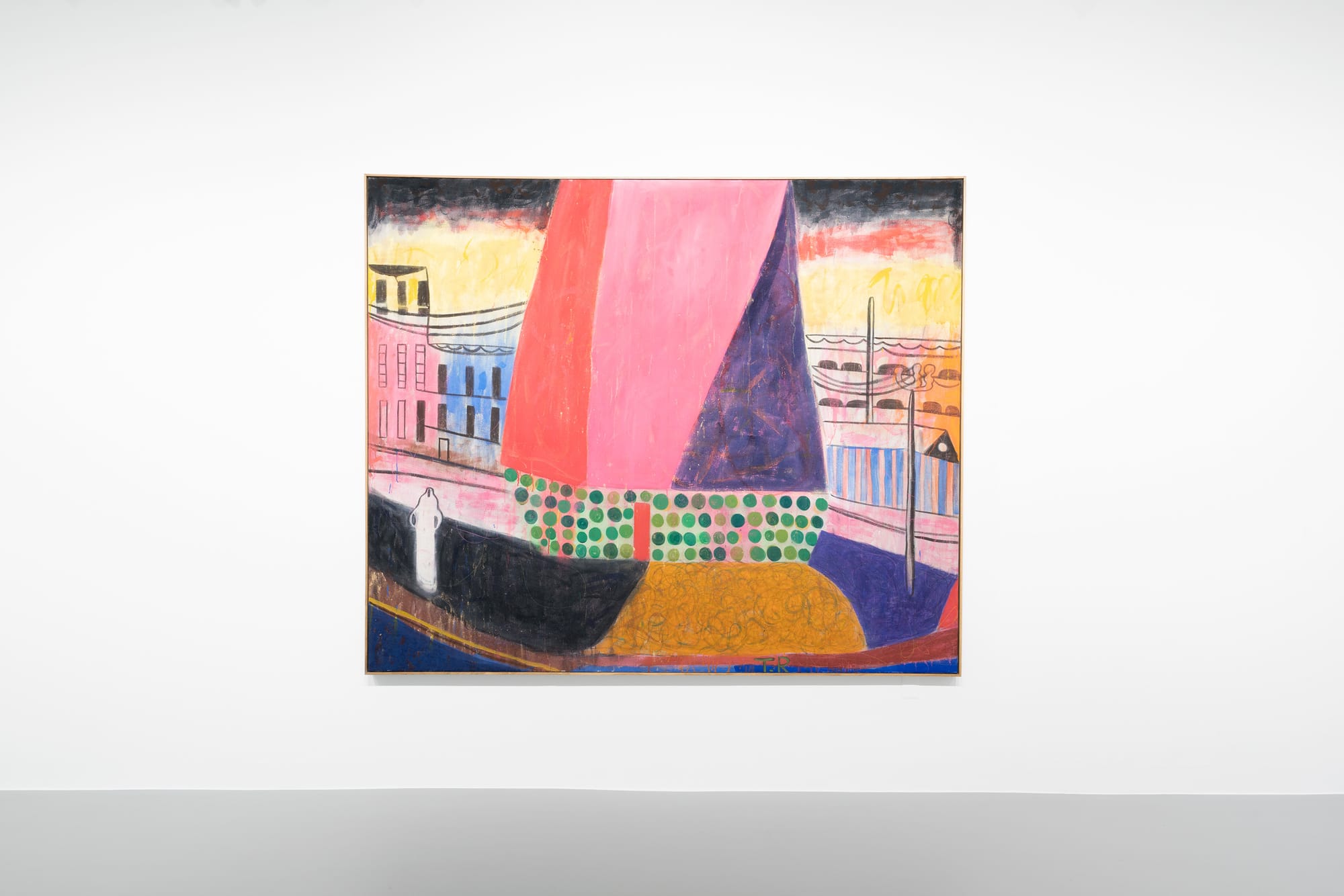 In his paintings of exteriors that lack people, the doors and windows of buildings are always closed, creating the impression of an abandoned city. “Red Roof” (2016) looks the most at home in a city like Philadelphia. Compressed into the left side of the canvas are rowhouses, telephone lines, and a fire hydrant. Perhaps the most exciting part of the painting is a large shape smack in the middle of the canvas. At quick glance, this mass could trick anyone into thinking it’s a sailboat, with a red, pink, and purple sail, like a malformed, tricolor flag. More likely, the shapes represent a building, filtered through Tal R’s imagination. The lower portion consists of green polka dots and a closed red door. The bright horizon suggests the painting takes place during the day, yet the aura the image evokes isn’t cheerful. There is an air of suspense. The door could open, something benign could emerge, or, just as easily, something with sinister intent.