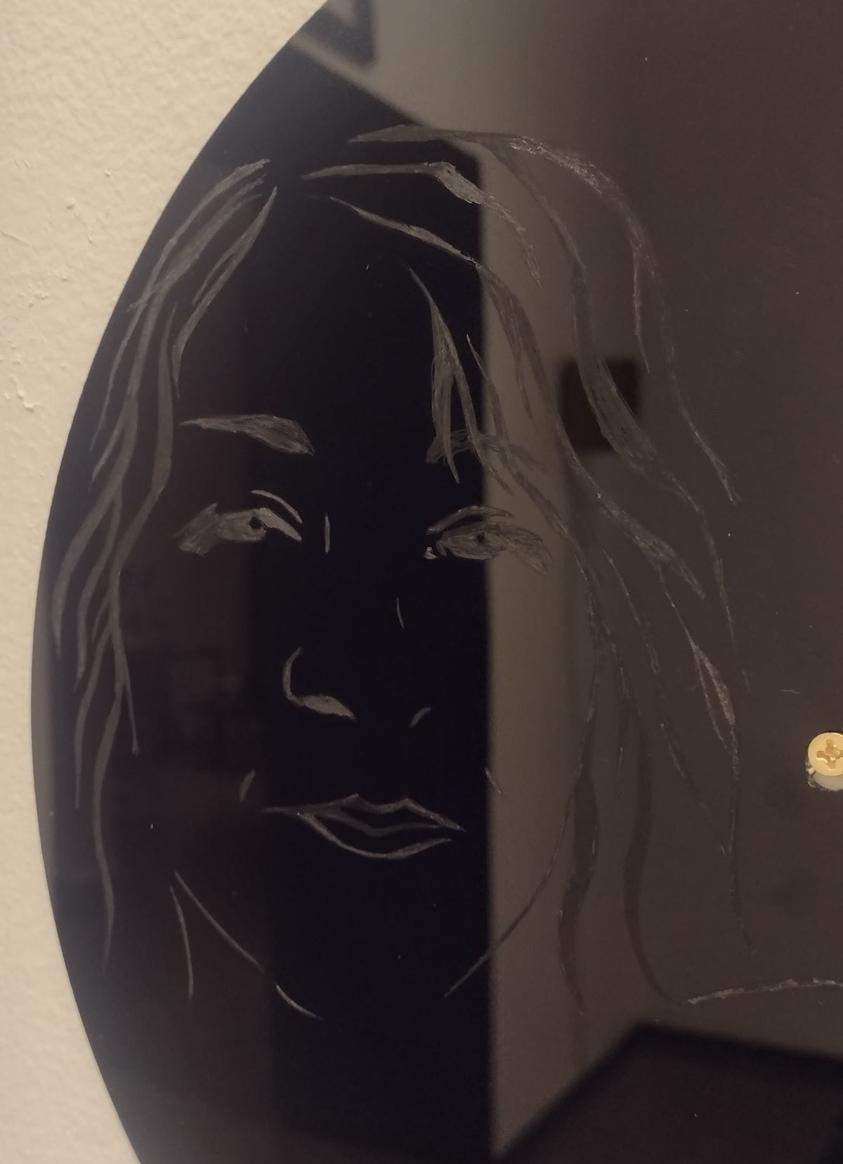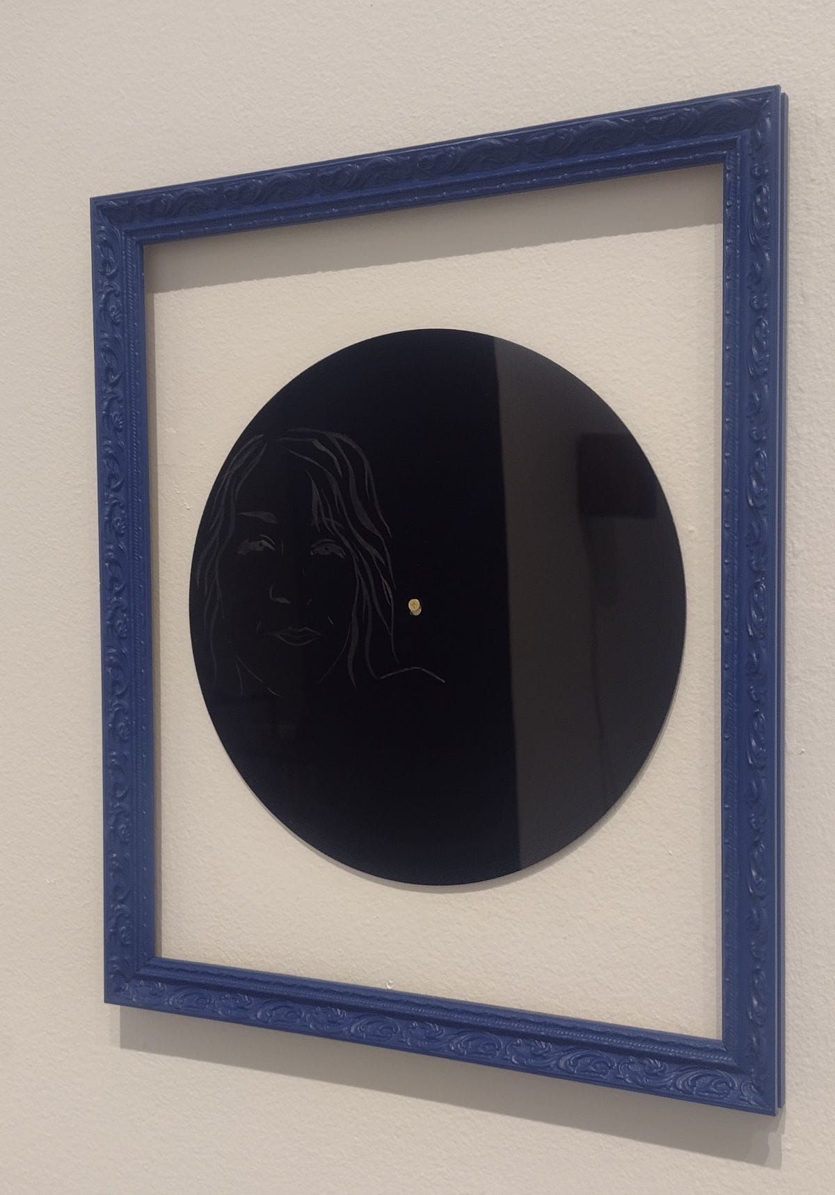 The small gallery houses vinyl records — absent during the opening but now framed and hung on the walls — onto which De La Cruz hand-etched portraits of their family members. One record player, in the center of the room, plays the artist’s recorded interviews with those family members, two chairs and headphones beckoning visitors to spend time listening to the stories. These informal oral histories, while specific to the artist’s family, speak to broader shared experiences — the struggle to survive, life lessons, sadness, joy, love, resilience. Framed by the room’s far opening, small plaques, stacked vertically on the wall, display the poem from the records, offering another chance to consider how experiences and memories are communicated, how connections are formed, and how relationships change.