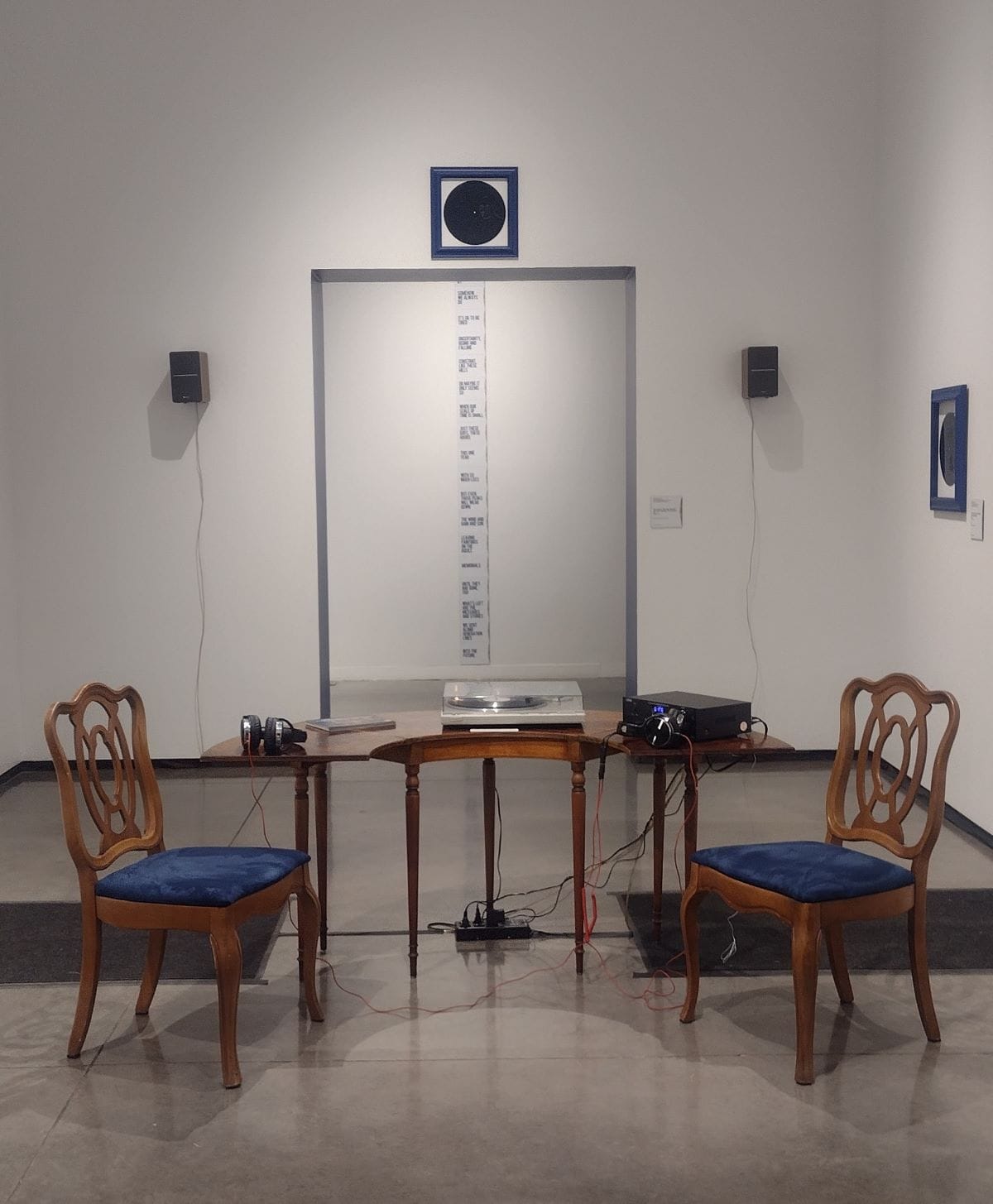 A deep royal blue effectively grounds the installation, applied to the walls, pedestals, frames, and chair cushions, as if to make visible the swells of emotions, the hue of sleepless nights, the feel of watching the sky through a window — to fill the otherwise seemingly empty spaces, for the record.