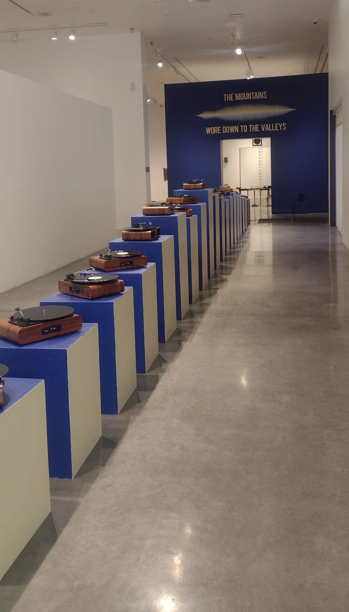 Today, each record sits motionless in its respective player, on a pedestal custom-made by De La Cruz, arranged in a single-file line down the center of a wide corridor leading to a small gallery. The varying heights of the pedestals create a ridgeline-like effect that mirrors that of the Sandia Mountains as seen from Albuquerque. Many of us in this high desert city orient ourselves by those mountains or the Bosque, the woods that border the Rio Grande, some welcoming the chance to wander through either.