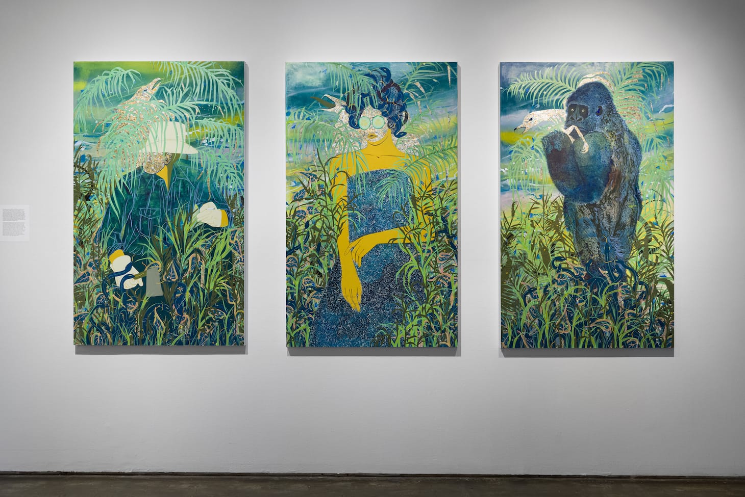 The exhibition’s three largest works focus on an archetype inspired by Nguyen’s experience in Forest City and all the different associations and memories her visit stirred up. In “Ape,” she depicts the animal looking back at the viewer, at once bewildered and perplexed; a bird is behind the ape and snakes rise up from below. The work references King Kong (there are movie studios in Forest City). For trivia experts who see a reflection of culture in little remembered facts, it is worth recalling that in Kong: Skull Island (2017), the 11th King Kong film since the first premiered in 1933, the character of San Lin, the Asian woman biologist, was continually rewritten and reduced until Alison de Souza, in her review in the Singapore newspaper, Straits Times, described the role as a “hua ping,” meaning a vase, something insignificant in the background, and the actress “hardly does or says a thing.”