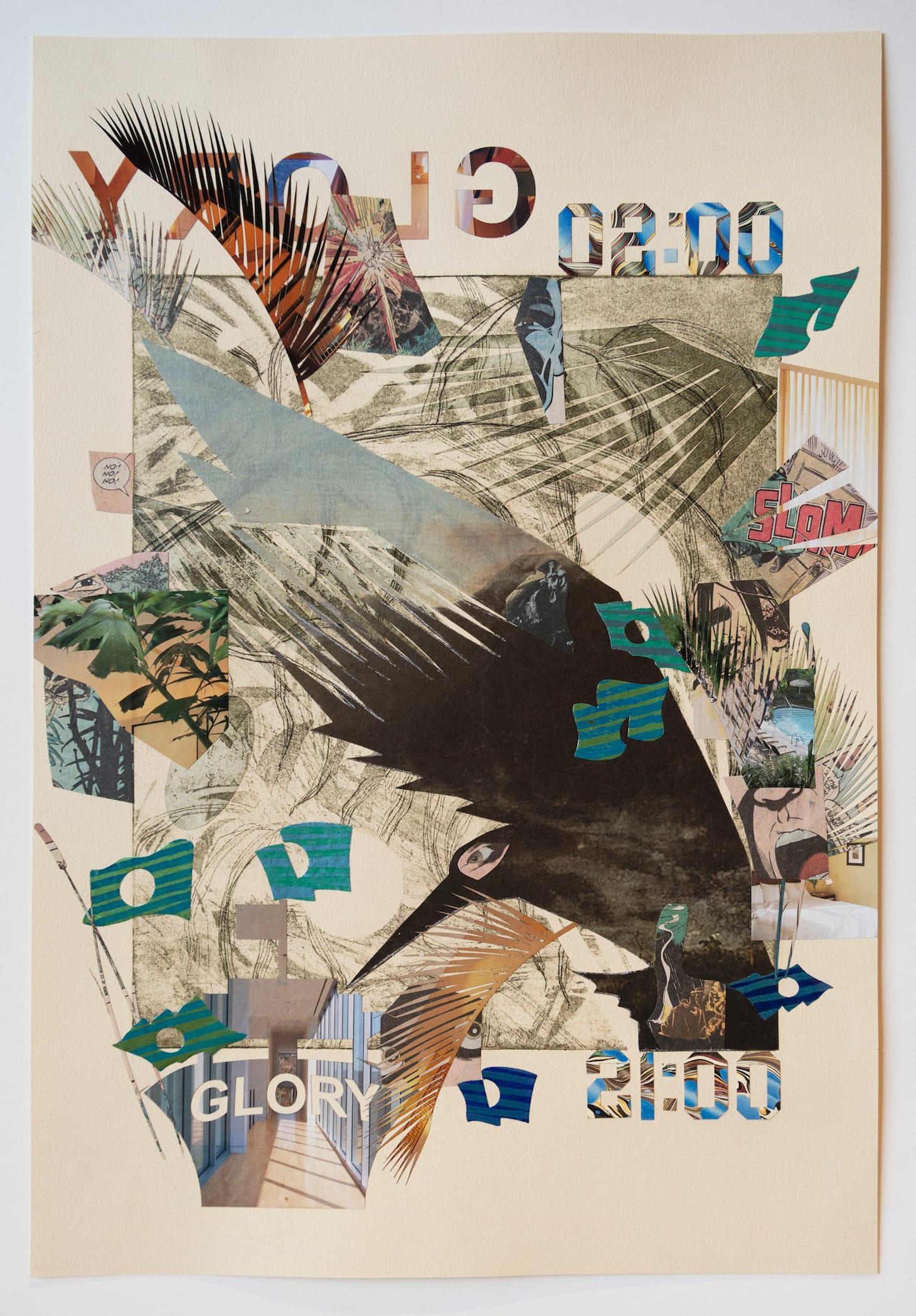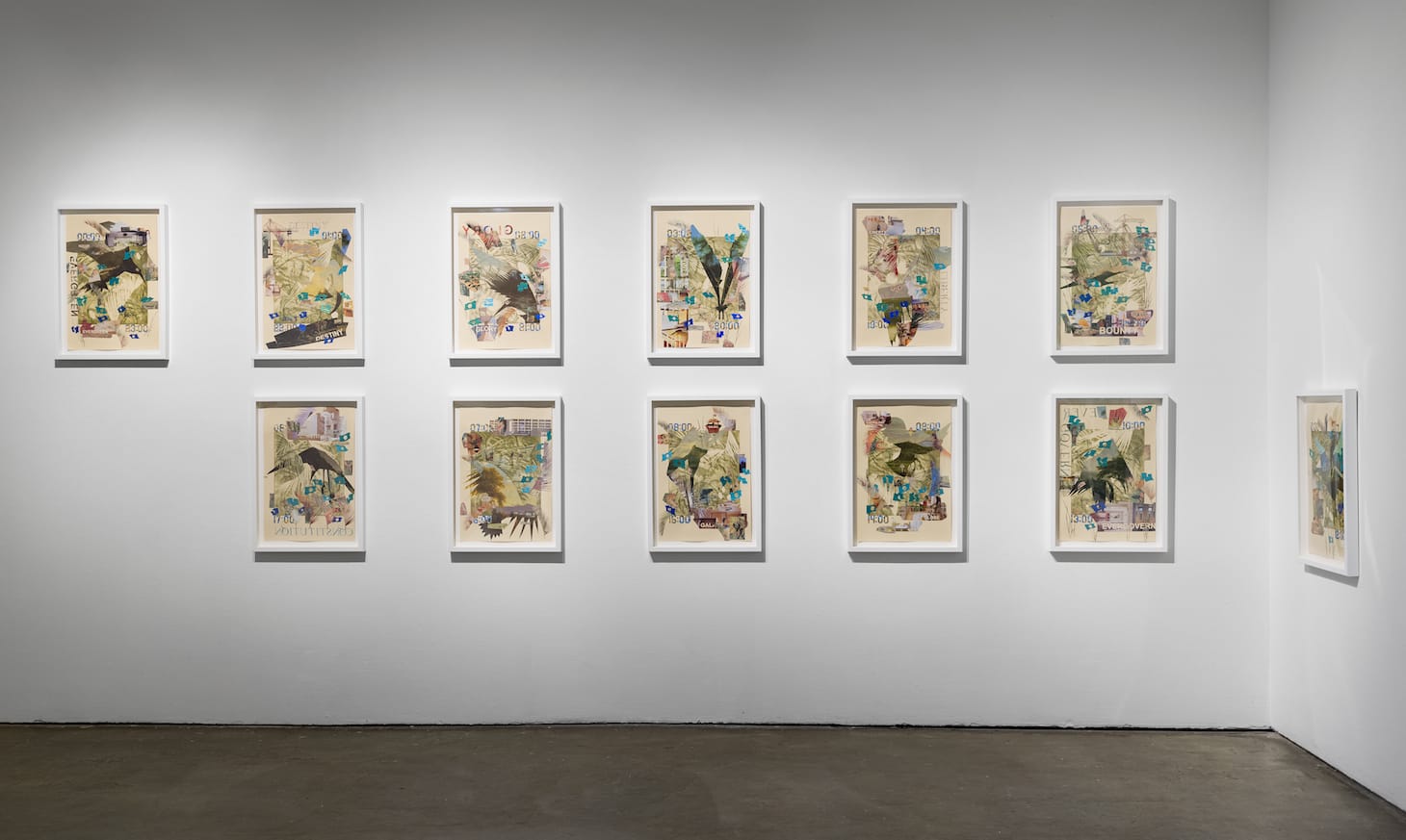 In each collage, Nguyen includes the name of the ship, a number referring to the time of day (which doubles as a reminder of the constant role shipping plays in the world’s economy), a negative space shaped like a bird of prey, in which another space is glimpsed, images taken from The 'Nam, a Marvel comic book series about the Vietnam War that was published from 1986 until ’93, and ran for 84 issues, and Forest City’s striped flag, with the sun literally cut out.