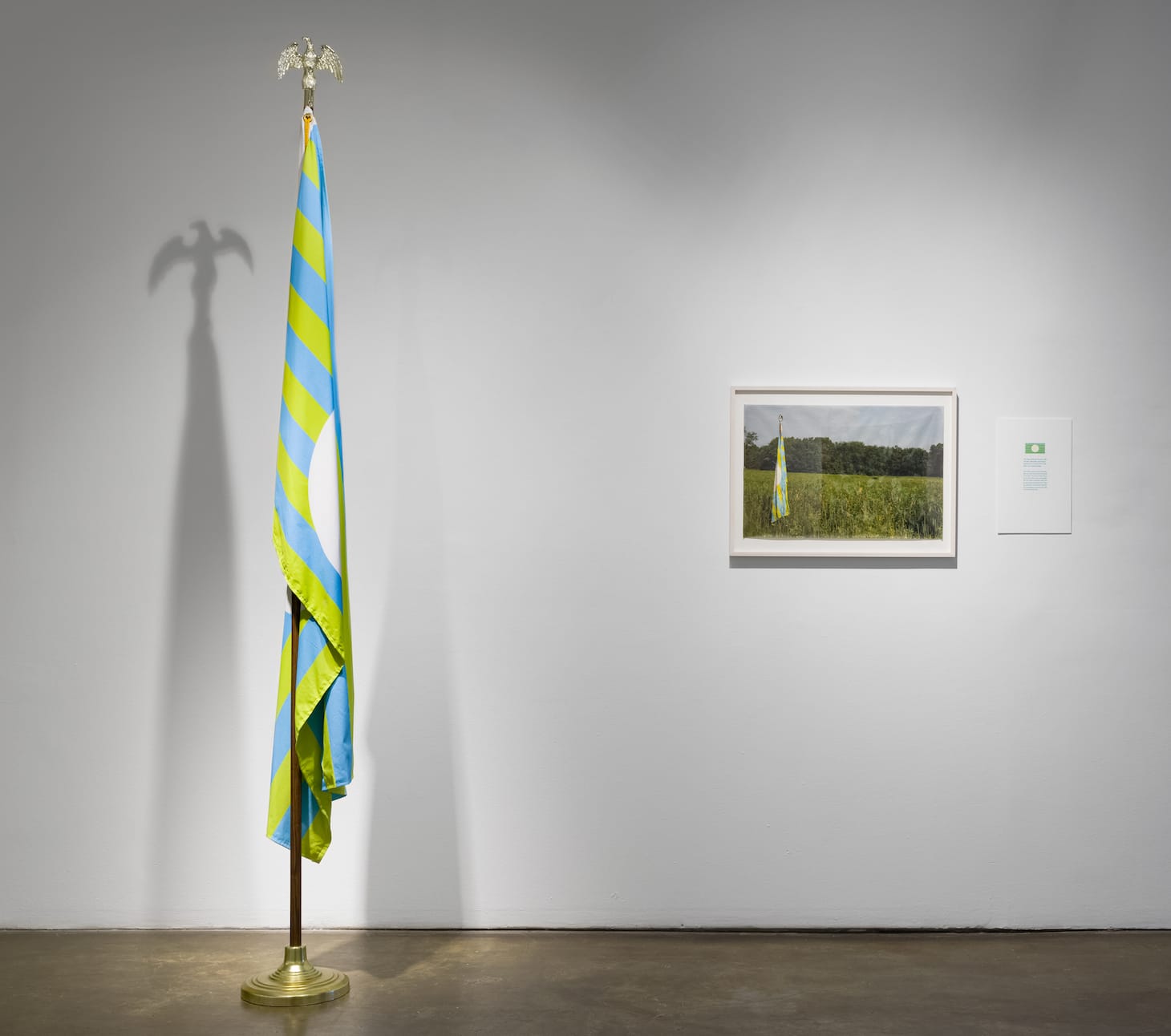 There is something wry and even melancholy about planting the flag of a real estate fantasy in the Singapore Strait in a nondescript field in Connecticut. It is the humor of feeling displaced, and wondering if there is any place that you belong. Maybe a sense of belonging is a thing of the past, a sign of privilege. This sense of displacement is emphasized by the inclusion of the photograph in the exhibition, and the actual flag, with a metal bird of prey topping the flagpole, just in front of it.