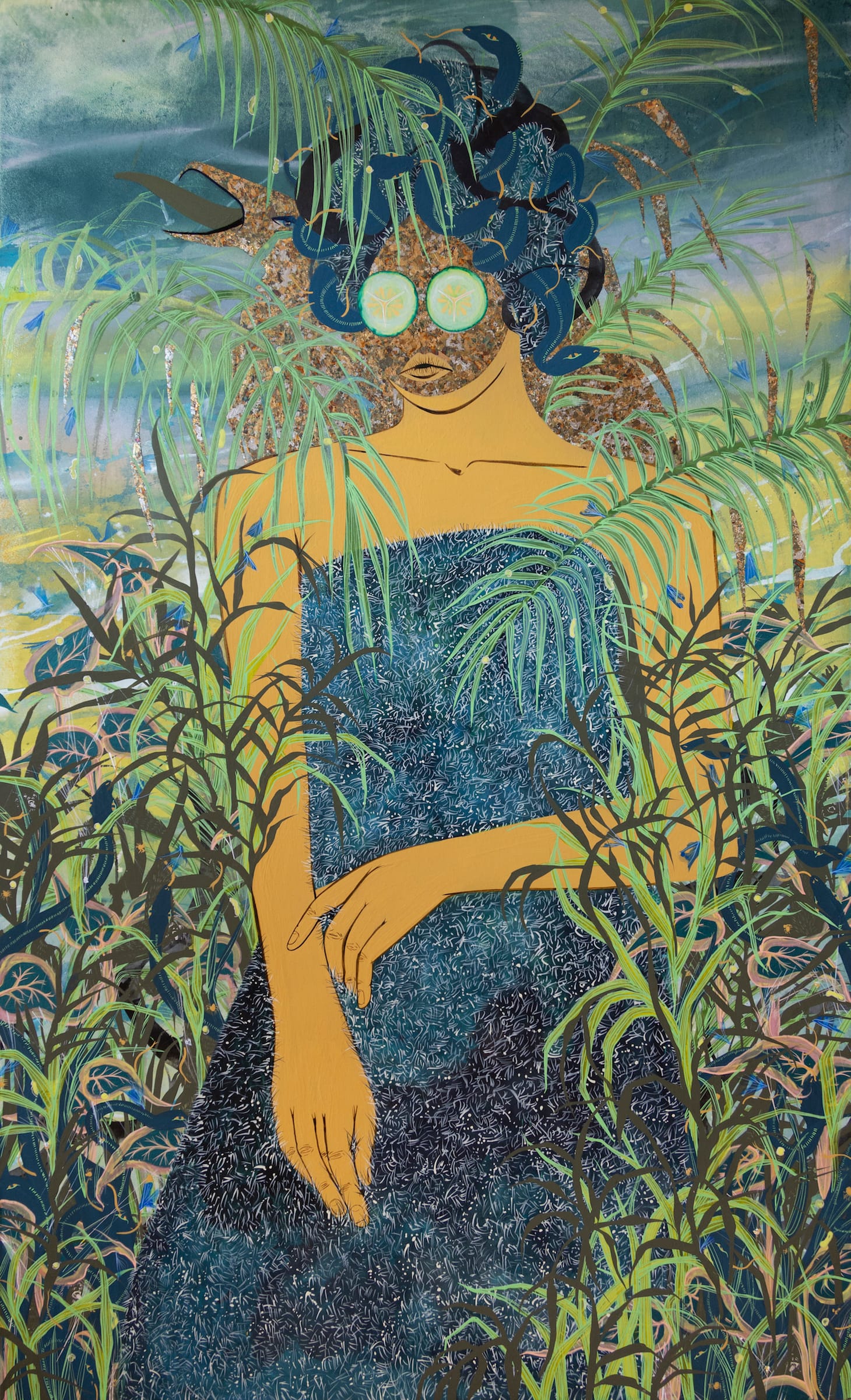 The woman in the painting comes across as absurd and hilarious. She has cucumber slices covering her eyes (a common beauty treatment) and stands in dense growth. Snakes are entwined in her hair (recalling Medusa), and a speckled, metal-leaf bird partially covers her face (is it also a mud pack?) and peeks out from behind it. If she is getting a beauty treatment, why is she standing in a tropical landscape, with snakes on both sides of her? The fact that Nguyen’s figure seamlessly compresses different narratives and archetypes, from Medusa to a smooth-skinned woman undergoing a spa treatment, is one of the strengths of her artwork. Her paintings and collages are immediate and visually compelling, but still require unpacking. It is with prolonged looking that Nguyen’s intentions begin to reveal themselves.