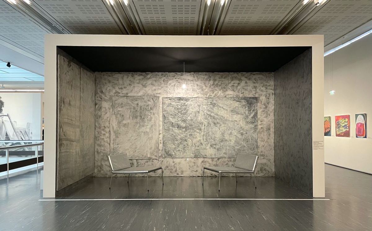 Installation view of "Moonlight" (1998–2001), a collaboration between Tamuna Sirbiladze and Franz West composed of a mural, paintings, and two chaise lounges in Tamuna Sirbiladze: Not Cool but Compelling at Belvedere 21, Vienna. On the left is one of several wall-sized photographs of Sirbiladze.