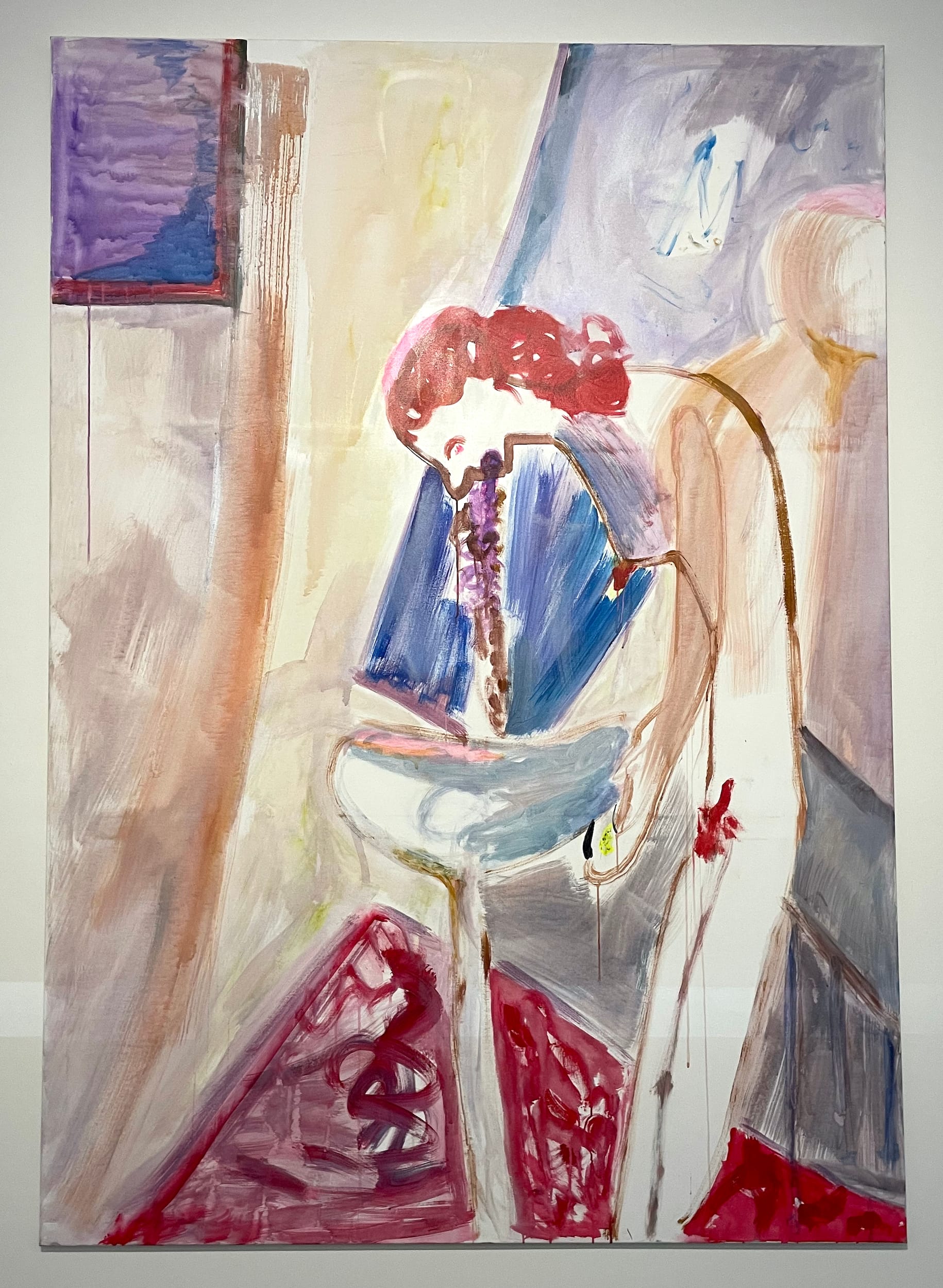 Among these paintings, two of the most distinctive are “Suicide Painting” (2007) and “Kotzen” (2005). Both center loosely rendered, almost cartoonish female forms: in the former, the woman leans backward, wide-eyed, a sharp diagonal behind her (or going through her); in the latter, she stands in a bathroom, vomiting into a sink, the tilted walls and red floor closing in on her. The image recalls Conrad Felixmüller’s shell-shocked 1918 print “Soldier in a Madhouse,” transposed onto women’s lives and bodily functions.