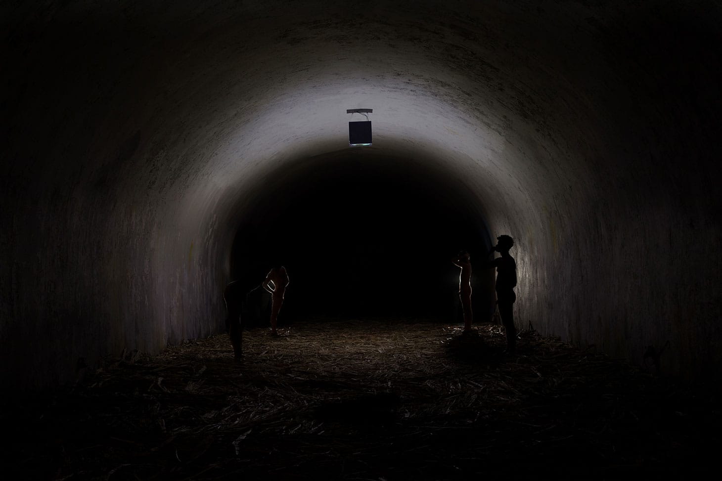 Four male performers stand naked next to the walls, making somatic body movements such as cleaning their bodies, bowing from pain, and bending their hands behind their heads. This choreography takes place in darkness while a pale ray of light bathes their faces and bodies from above. The dark environment condenses the smell of the sugarcane, producing a soporific, intimate sensation. In the middle of the gallery, a TV screen projects black-and-white images of Fidel Castro in different moments of his heroic, revolutionary trajectory. The Cuban leader also appears performing the quotidian activity of swimming; this footage, according to Fuentes, was mostly taken from the pro-Castro US filmmaker Estela Bravo’s various propaganda documentaries.