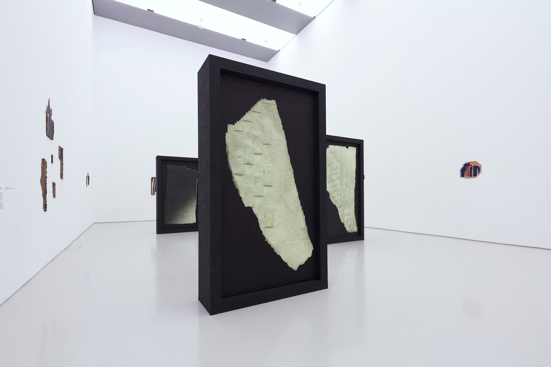 The paper works are also offset by a series of cast bronze wall sculptures that cradle chunks of foraged pigments. Small and rectangular, they refer to the “Baghdad Battery,” a clay jar and stopper from c. 150 BCE, which was believed to have the power to raise the dead. Sasraku thinks of these bronzes as “activating batteries,” energizing the other works in the show and tying them together. She sees strong parallels between electrical charges and spiritual energy, or the energy fields emanating from landscapes.
