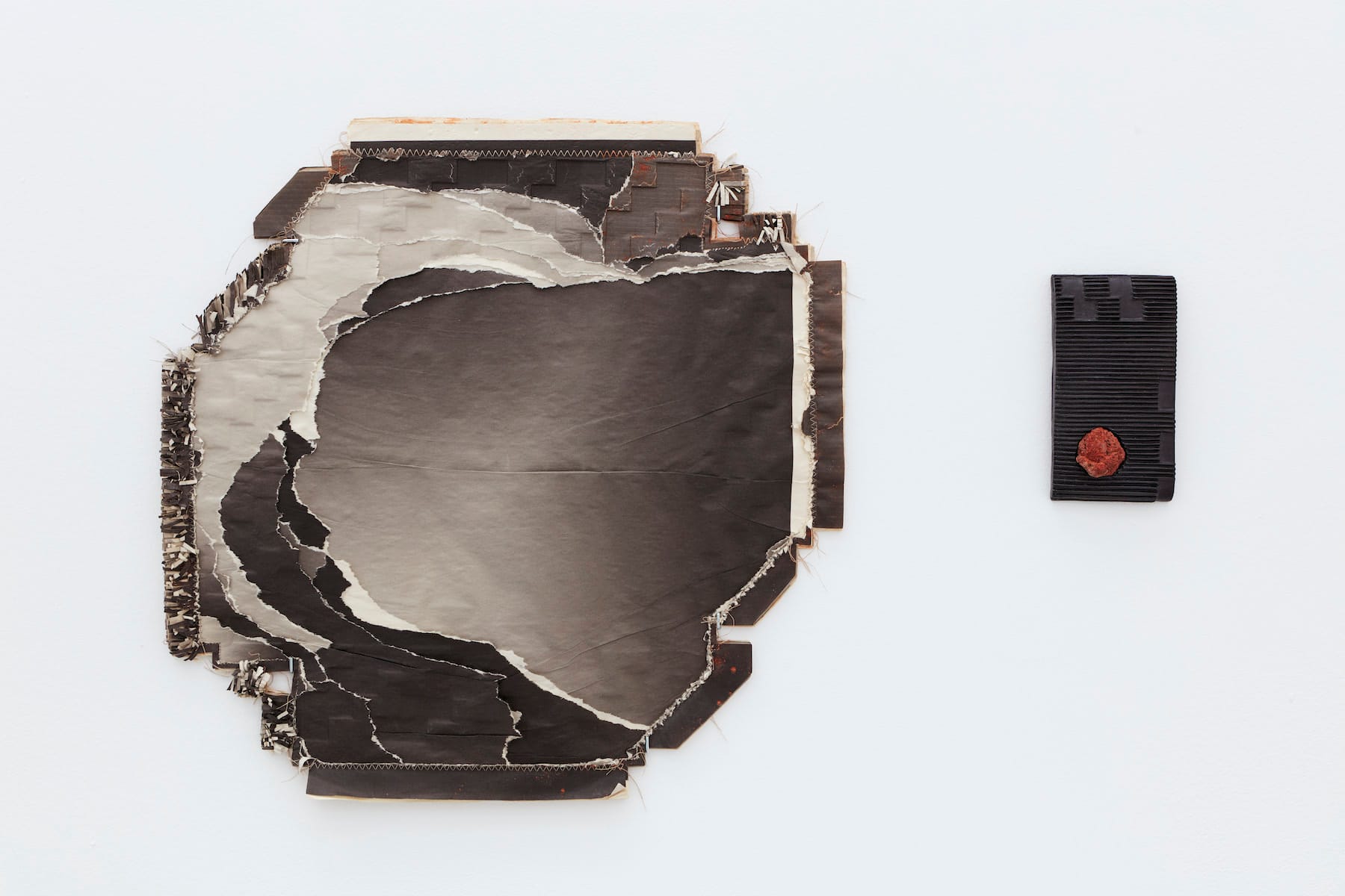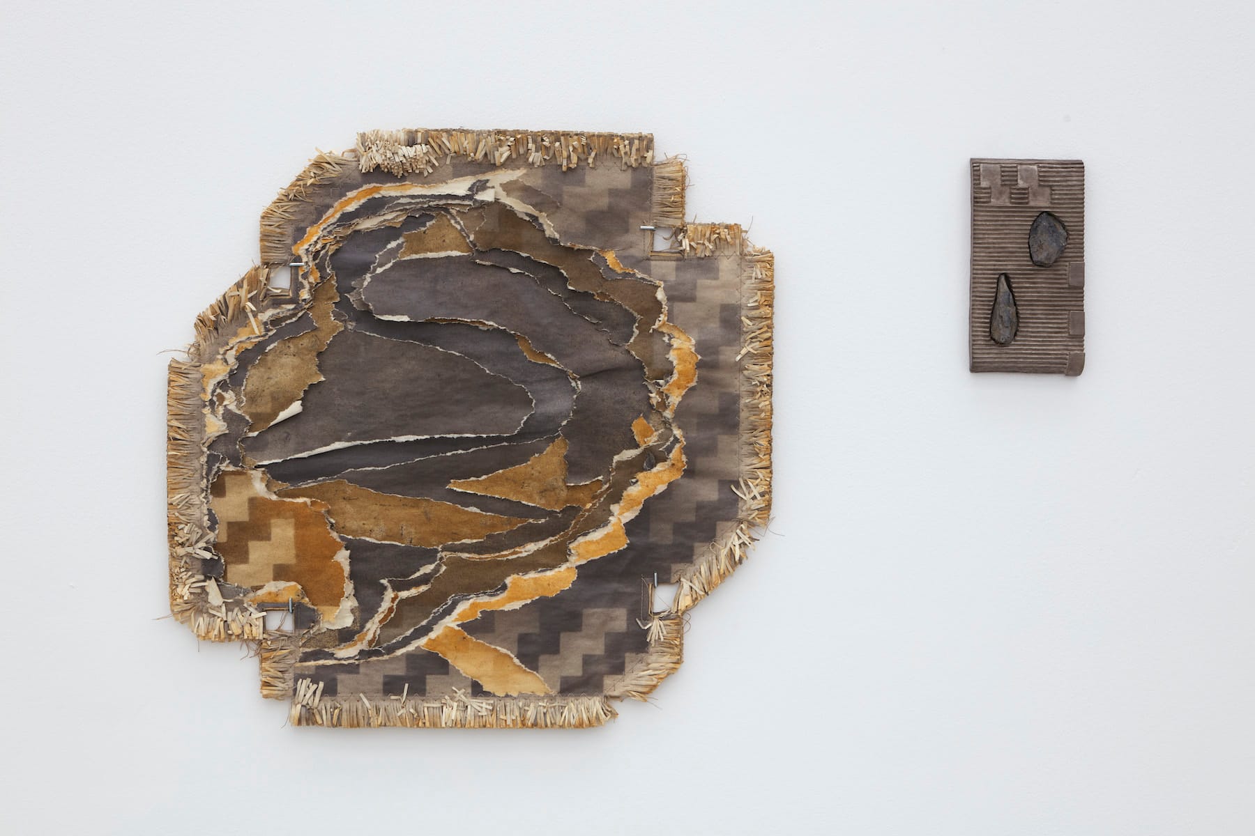 The works in the exhibition are born from Sasraku’s engagement with Dartmoor — the huge moorland in Southwest England near where she grew up — and the Scottish Highlands, the site of a recent residency. To create her Terratypes, she begins by rubbing blank newsprint with pigments derived from raw materials she forages from these landscapes, such as ochre, graphite, and manganese. She then binds together multiple layers of the newsprint with an industrial sewing machine, creating a stitched seam around the edge. Next, she soaks the sutured stacks of paper in a body of water, such as a boggy pool. Finally, the layers are torn away in strips and manipulated to create abstract patterns and areas of contrast.