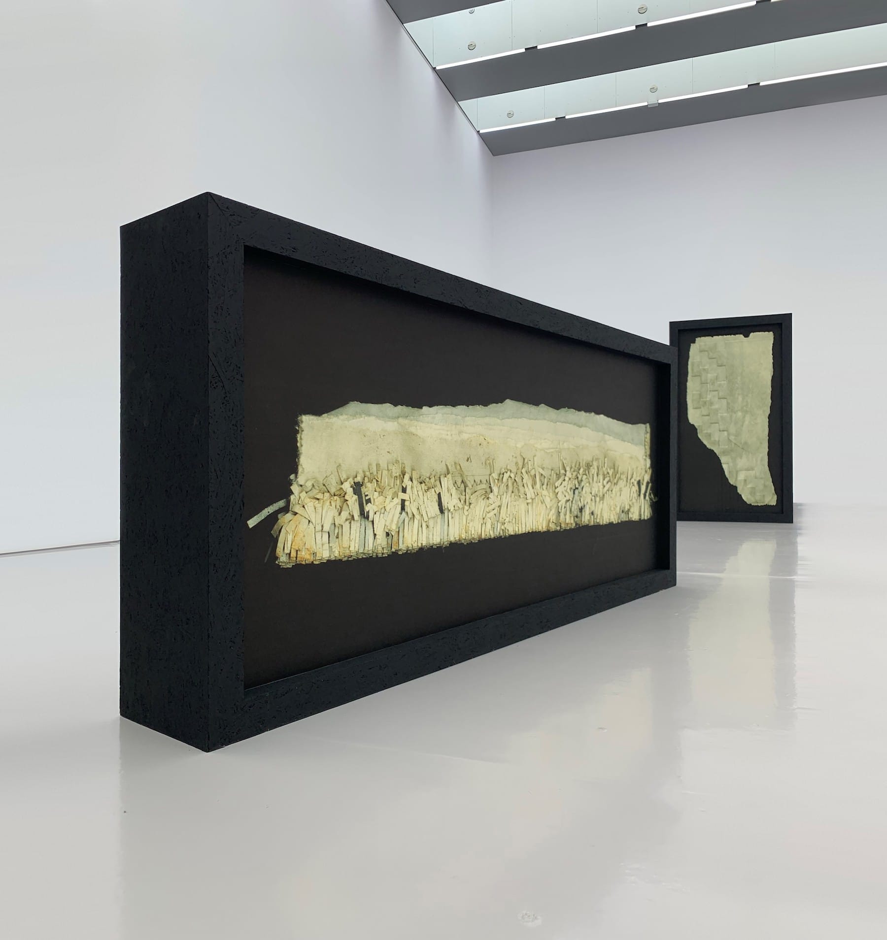 In Terratypes, a relatively simple idea is effectively expanded in multiple directions to fill the exhibition space. The large-scale collection of five freestanding works titled Liths that occupy the center of the gallery are firmly rooted in the wall-based Terratypes and the artist’s process of making them. To create these more sculptural pieces, Sasraku began by scanning fragments of the saturated newsprint torn from the surfaces of the Terratypes, then printing the high-resolution images onto large sheets of handmade Japanese paper, mounted back to back, and framed in substantial black wooden supports.