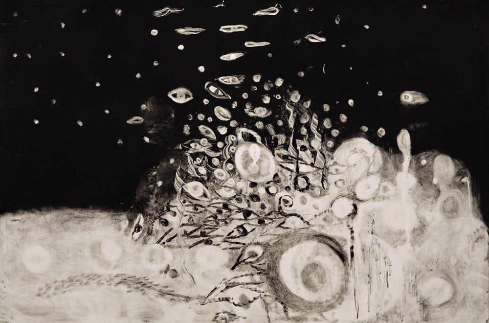 Sabharwal’s keen eye for color and nuances in hue, such as in “Steam” (2017), are demonstrated throughout the exhibition Float. And for someone who manipulates shade and tone as deftly as she does, it’s impressive that her sense of compositional structure is just as strong — which can be seen in the black and white print “Anniversary” (2016), which depicts what may be dandelion wisps wafting to the foreground to become a garden of human eyes settling onto a bone-white ground below. Loveliness lives in her hand.