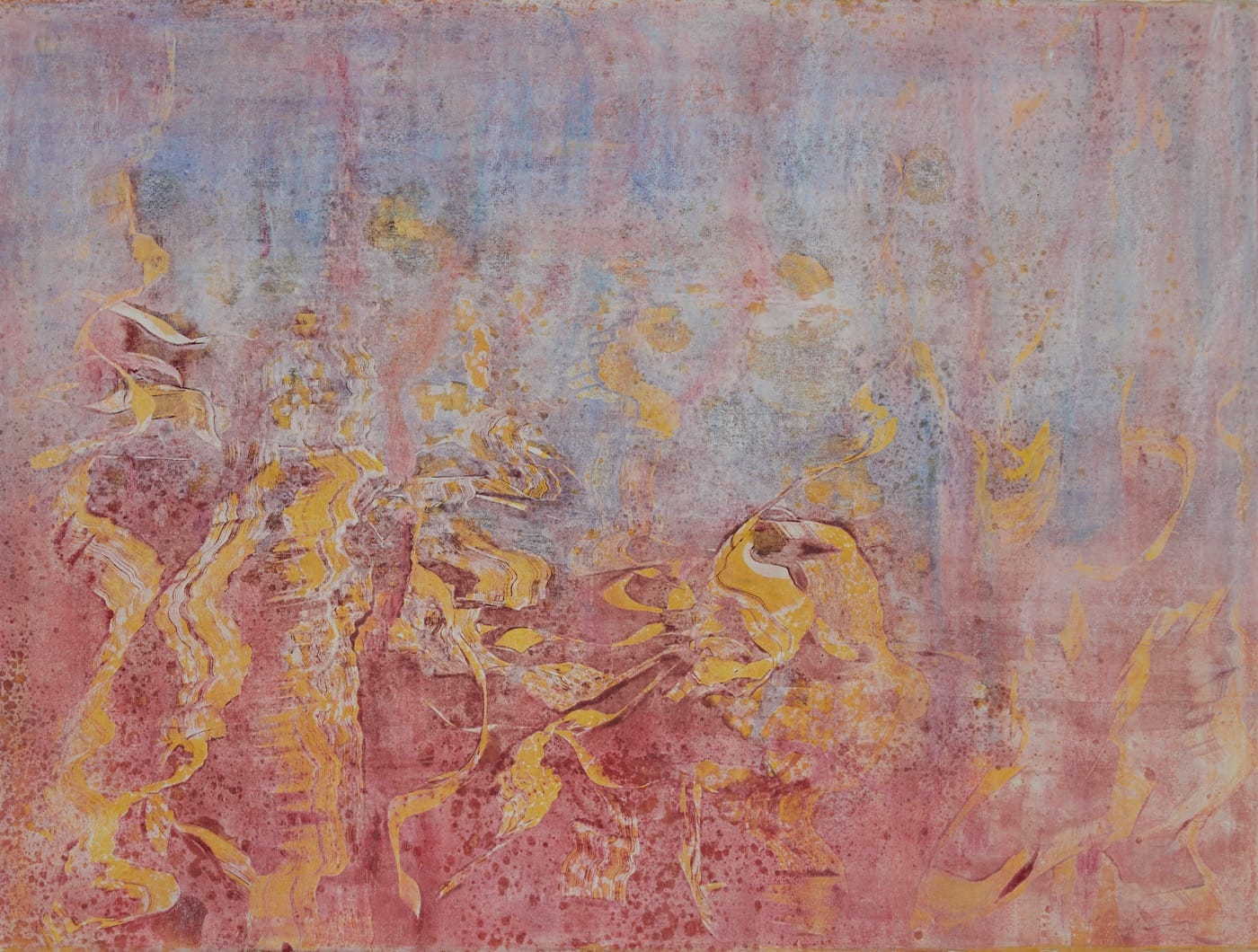 It doesn’t take me long to be absorbed by several of the pieces in Tara Sabharwal’s show at Wilmer Jennings gallery at Kenkeleba House. The artist, who was born in New Delhi and trained in Baroda, India and London, has a facility with a painterly abstraction that leans toward the decorative but doesn’t ever fall all the way in. The works I gravitate toward began their lives as prints, made with oil-based etching inks, and then (after some rumination) Sabharwal subjected them to transparent washes of watercolor and opaque pastels. Her hybrid monoprint paintings are delicate and layered; she can make objects float in the neither-here-nor-there ether, or form effulgent cascades that might be microscopic views of plant cells, a golden beach at low tide, or the god-like torrent that impregnated Danaë — this is how “Sparkle” (2014) reads to me.