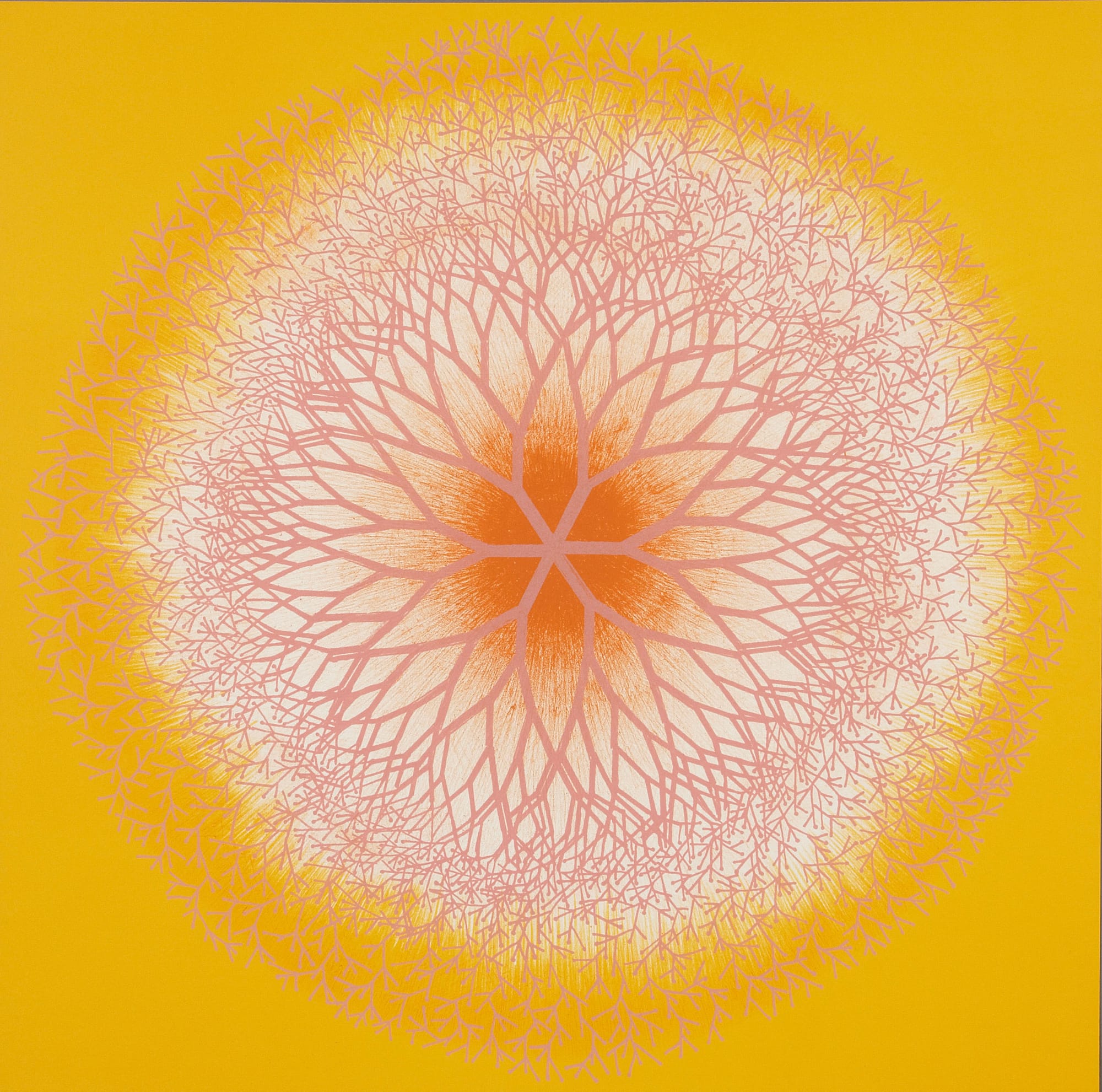 Ruth Asawa produced more than 50 lithographs while at Tamarind, ranging from tender family portraits to abstract interpretations of local flora. The relationship between Asawa’s works on paper and her ethereal looped wire sculptures is clearly visible in “Desert Plant” (1965). Rings of spindly plant fibers radiate out from a central burnt-orange core, reiterating the spherical dimensionality that often characterizes her sculpture. Asawa’s bold use of color — a spectrum of pinks and oranges against a rich yellow background — is indicative of her experimentation while at Tamarind.