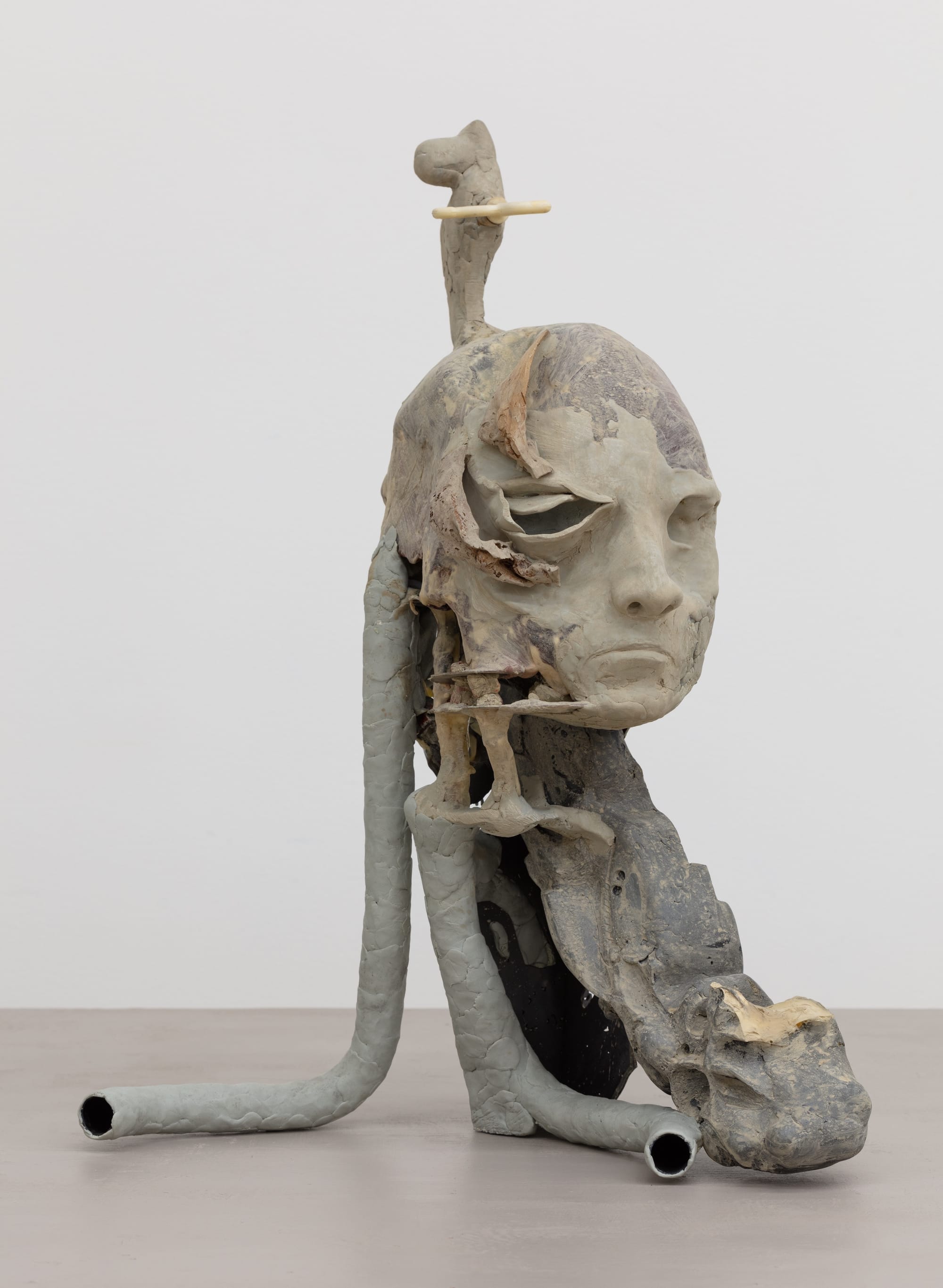 Ivana Vukšić and Bruno Pogačnik Tremow both grew up in the Balkans during the Croatian War of Independence (1991-1995). Now based in New York City, their shared experiences inform their dystopian worldview. In life-size figurative sculptures, disfigured humanoids are composed of various junk materials — pieces of wire and rope, human and coyote teeth, and scrap metal from the Brooklyn-Queens Expressway. Through expression and posture, these works create a subtle narrative. At opposite corners of the gallery, a tall motherly figure clutches its offspring and directs its gaze toward a towering skeleton with a sculpted human face. The head of the latter, mounted on a long aluminum beam, is bent downward and to the left, conveying a coy sense of shame.