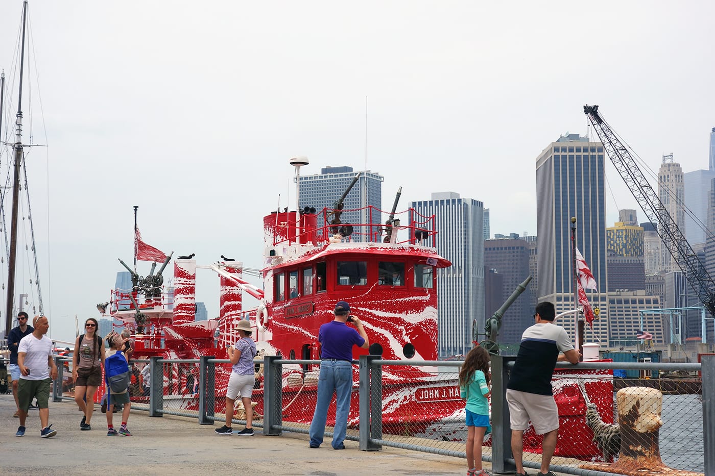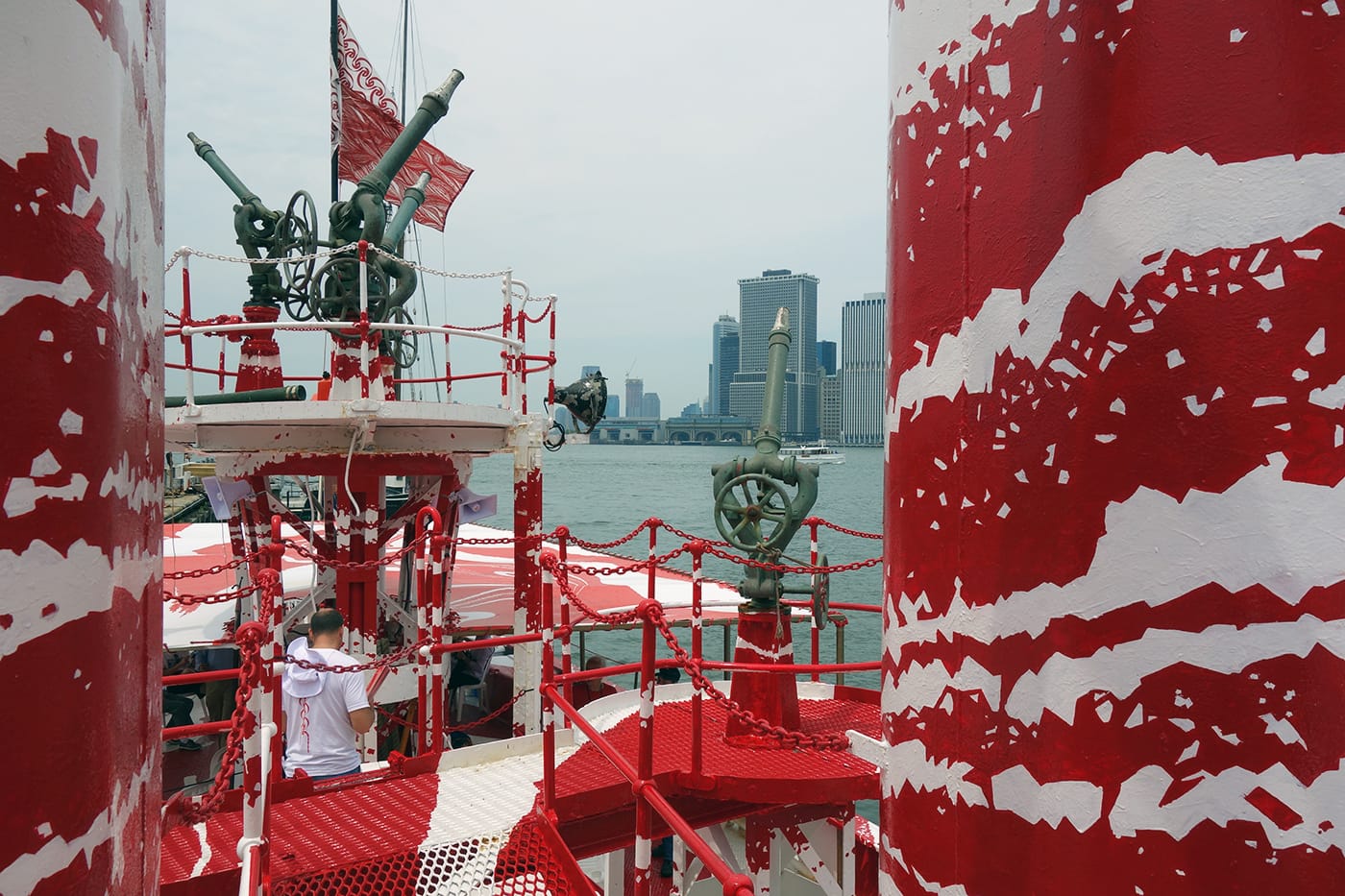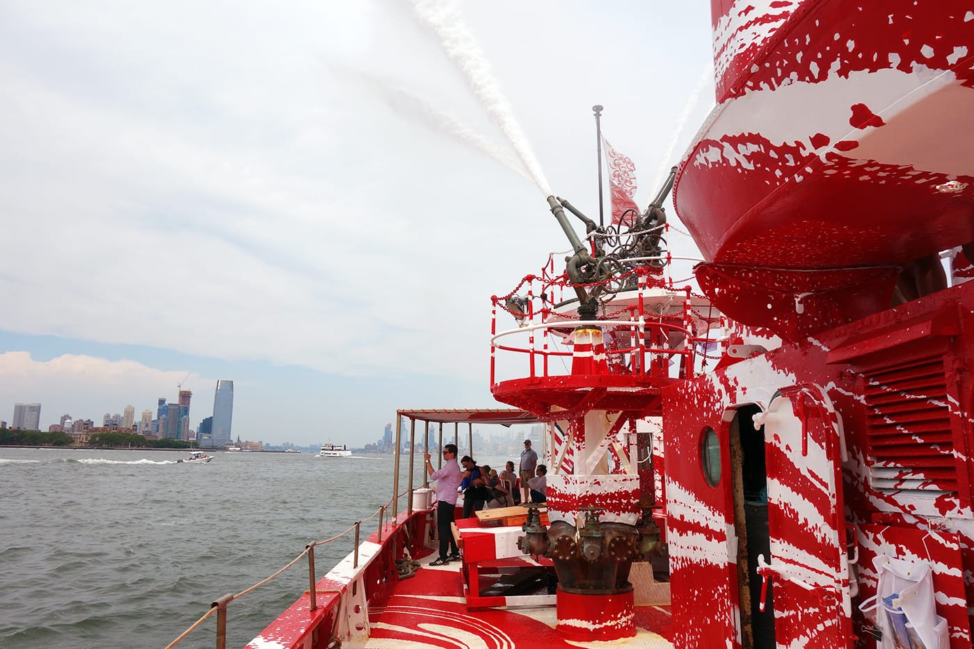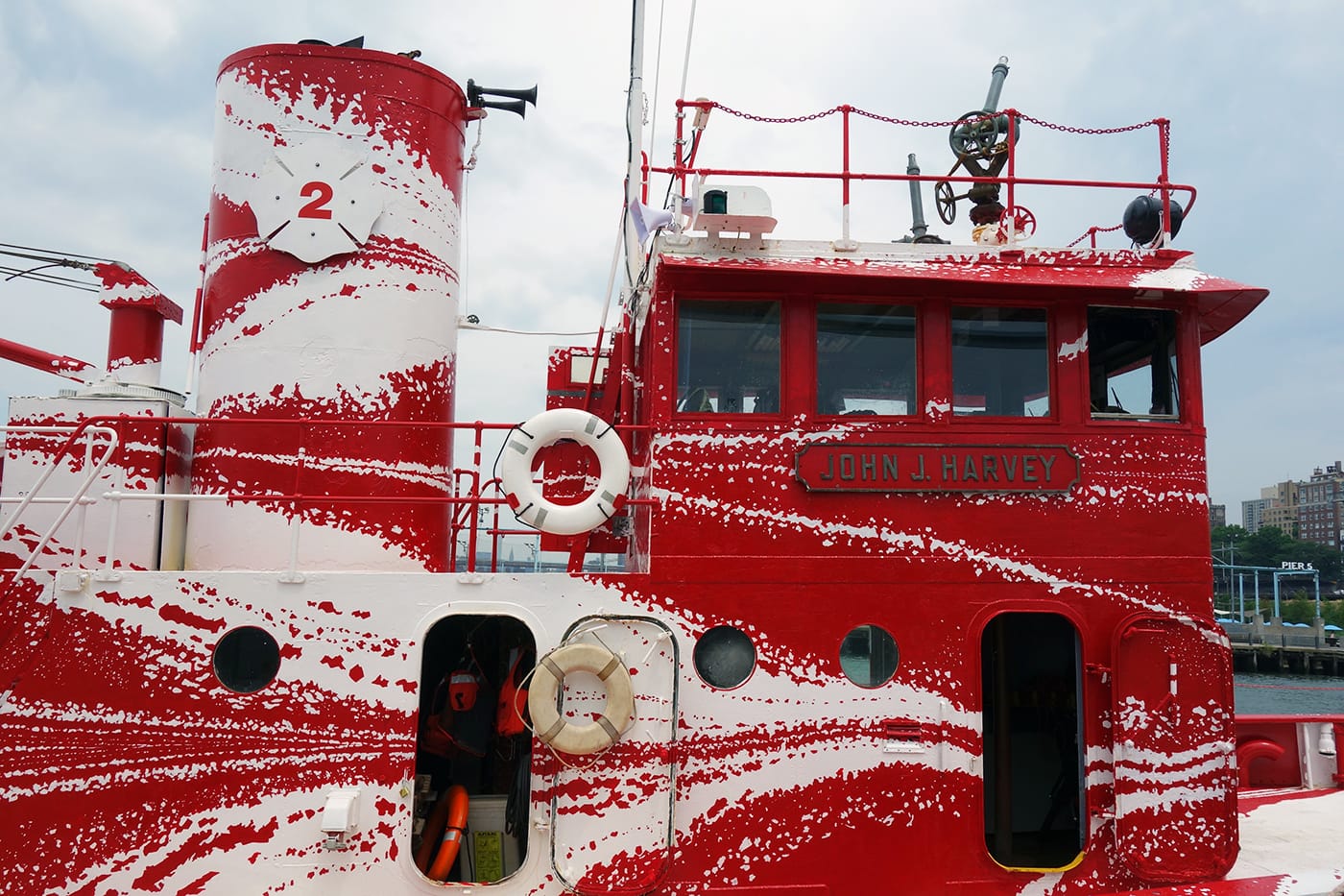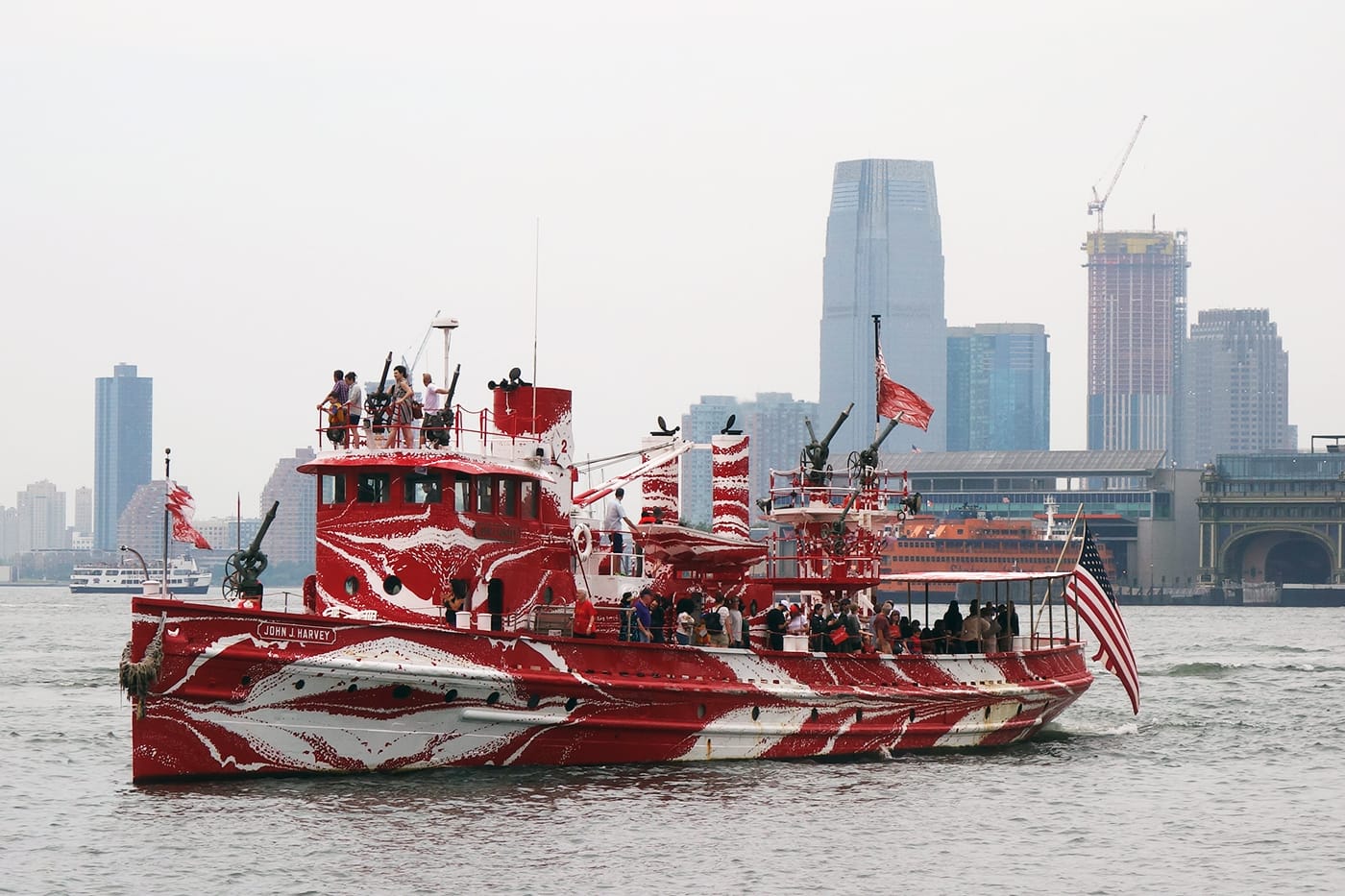 The John J. Harvey fireboat has cruised the New York City waterways since its launch in 1931, but this summer the ship has a radical new look. Painted in a flamboyant pattern of red and white, it’s hard to tell which end of the ship is the front, or even which direction it’s headed. “The captain has had a quite a laugh because a lot of the other boats on the Hudson have been radioing him and asking what happened, has the Harvey been through a blender?,” said Emma Enderby, Public Art Fund adjunct curator.