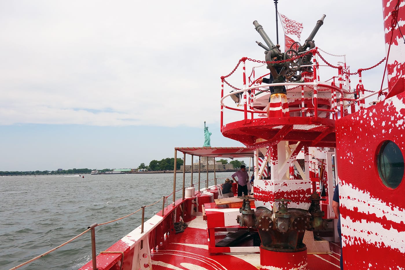 Although the tactical success of dazzle camouflage is difficult to assess — it didn’t protect all ships from U-Boats — sailors did report an increase in morale when their ships were outfitted in such buoyant patterns. Riding the Harvey on a recent July afternoon, it was enjoyable to spend time immersed in the exuberant design, which included everything from the lifeboats to the prow where custom marbleized flags fly. But the most thrilling moment came when the ship was sailing by the Statue of Liberty, and its firefighting cannons gave their salute, the fountain of water shimmering in the sunlight above the whirling red and white paint making for a truly dazzling sight.