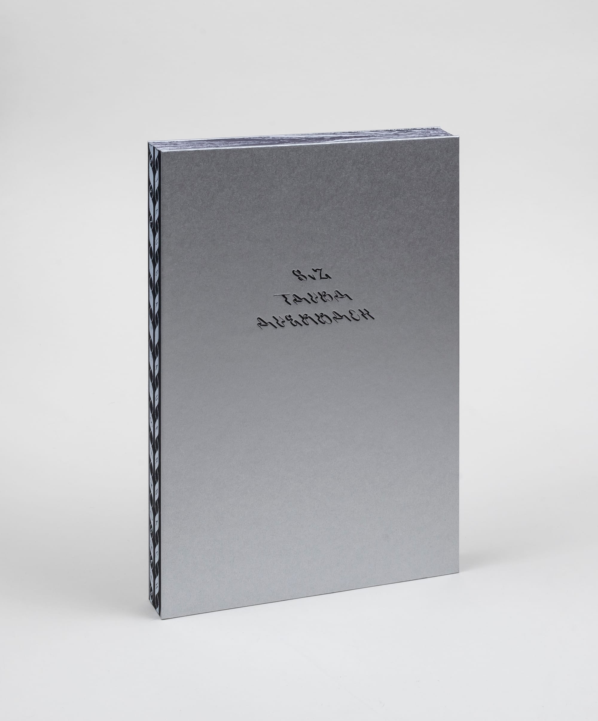 The book form is well suited to considerations of time and dimensions. These are concerns that preoccupy artist Tauba Auerbach. Auerbach’s research-based practice explores scientific forms and patterns — for instance, geometric structures such as waves and helixes. These interests manifest in a precise design sensibility that is apparent in every aspect of S v Z, the exhibition catalogue that originally was meant to accompany her postponed survey show at the San Francisco Museum of Modern Art, curated by Joseph Becker and Jenny Gheith. A simplified color palette of silver, light gray, and black (except for full-color art reproductions) cohere this book as an object, reflecting Auerbach’s signature marbled papers, which serve as end-pages for this book and adorn the page edges. While the front and back covers are study hardcover, the spine is an exposed cloth ribbon, ornamented with a helix design featuring the artist’s name, as well as the exhibition title, and publisher, with each letter inside a string of the helix.