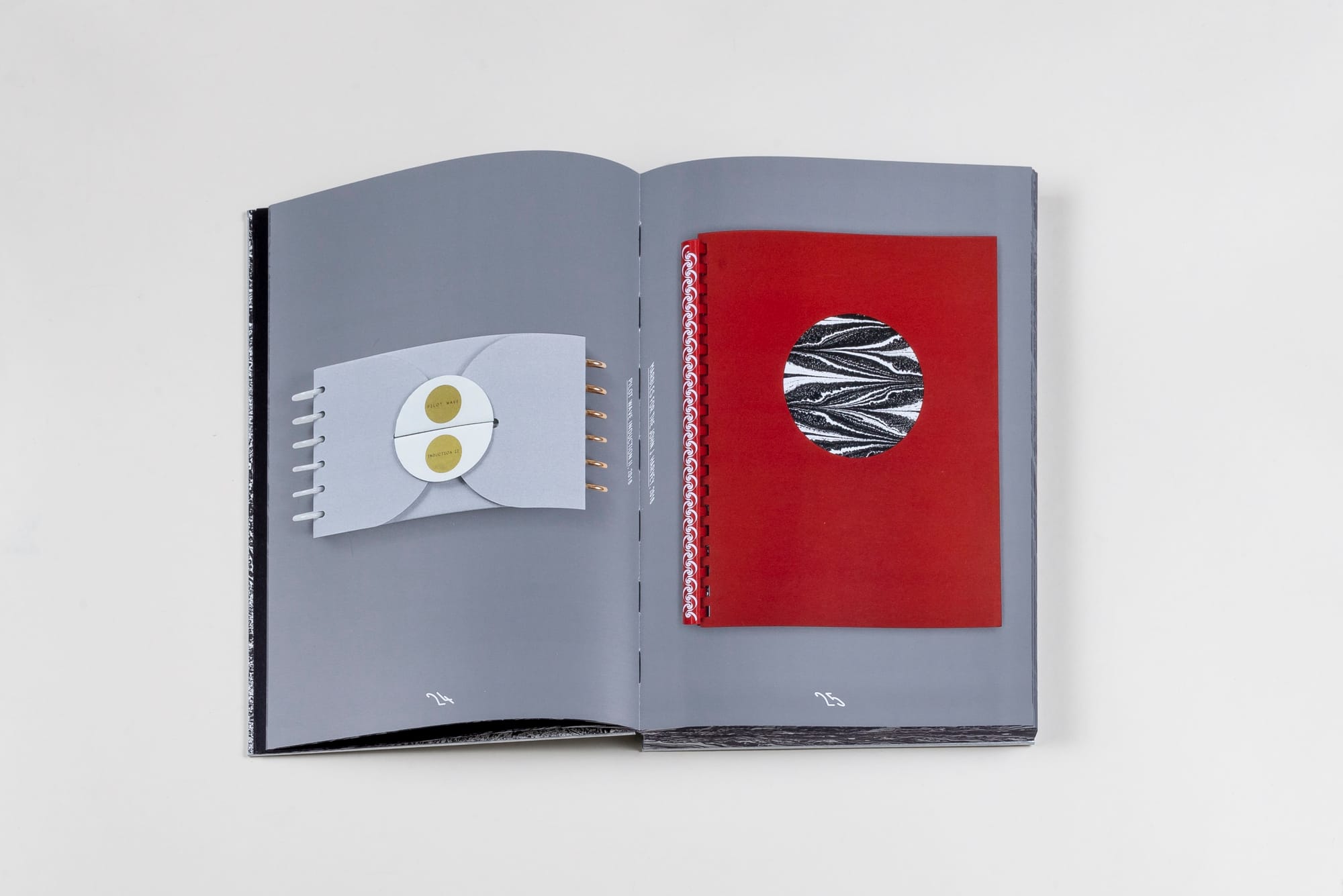 In addition to her installations, prints, typeface designs, and digital projects, Auerbach has produced a number of artist books and even created her own imprint, Diagonal Press, under which she still publishes. Her publications are often housed within elaborate book containers with openings, interlockings, and folds, that also stand alone as sculptural objects. For example, Pilot Wave Induction (2013), published by Diagonal Press, documents Auerbach’s experiments related to the titular quantum physics theory regarding the movement of particles and waves. Two books with metal and plastic disc bindings are stored together in a custom rectangular four-part box with velcro and stickers, which interlocks around the stacked books, so the spiraled edges emerge on the right and left sides.