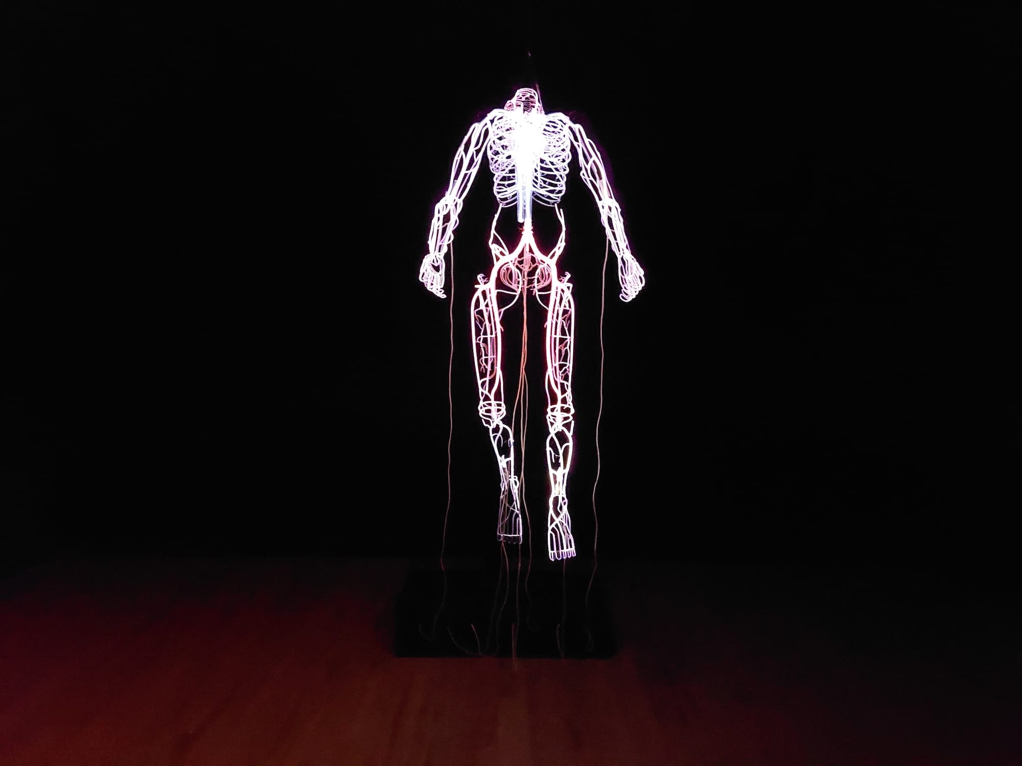 Throughout There Is Light Somewhere as a whole, the Bahamian artist is interested in telling the stories of unsung people of color who played key roles in crucial events of Euro-American culture, such as the Space Race or Polar exploration. For instance, “Henson” (2012) depicts Matthew Henson, a Black American explorer who may have been the first individual to reach the North Pole, though history credits White American expedition leader Robert Peary. Similarly, a pair of neon works reference Robert Henry Lawrence Jr., the first Black astronaut. Lawrence died after an ejector seat failed; in “Robert” (2018), a floating human form flickers disconcertingly, as if suspended in the infinitesimal moment between life and death.